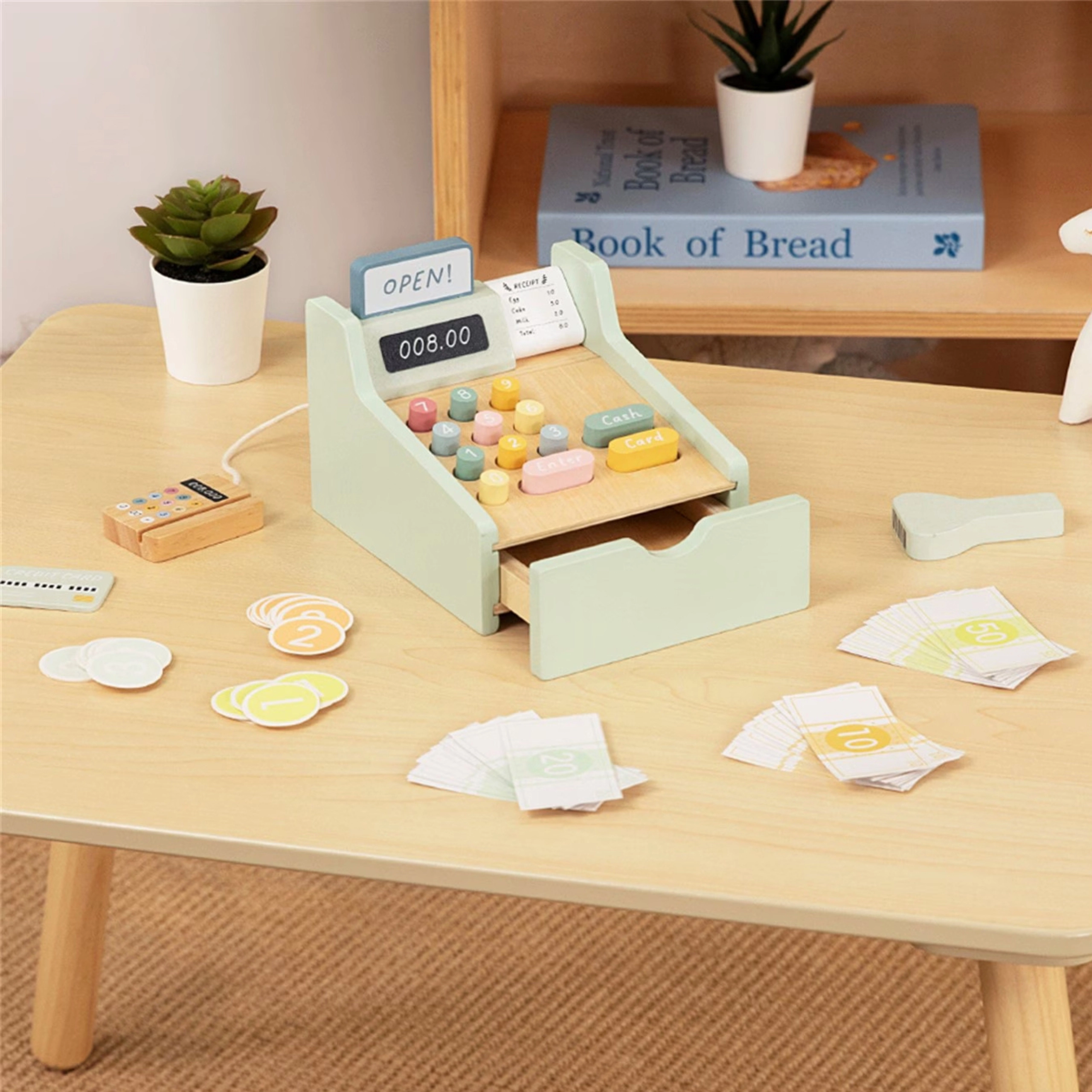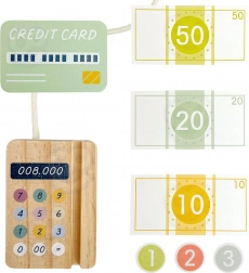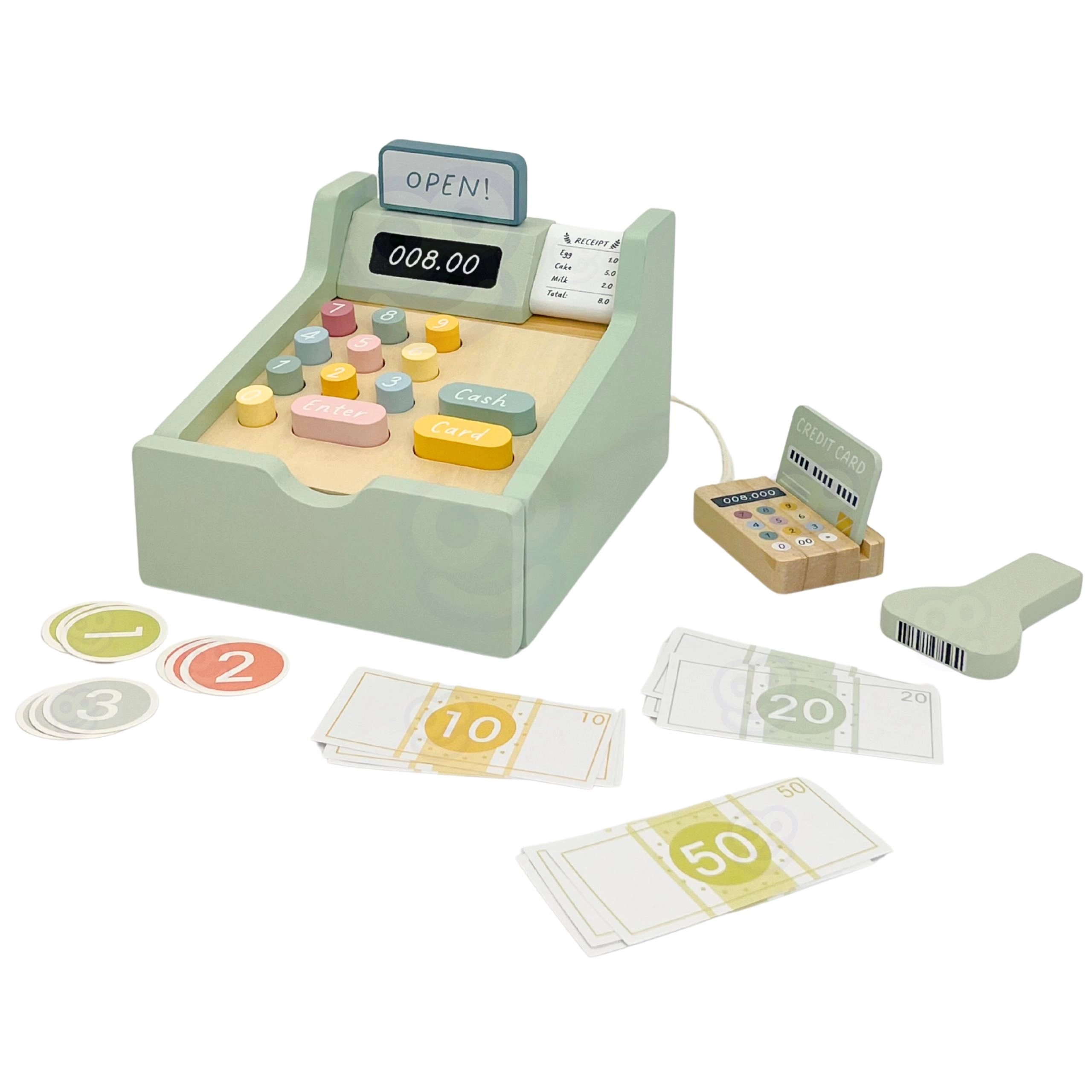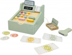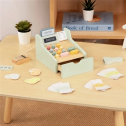 Set obsahuje všetko, čo malý predavač potrebuje: drevenú pokladňu s farebnými tlačidlami, skener, čítačku kariet, platobnú kartu, mince a bankovky. Hra rozvíja logické myslenie, matematické zručnosti, koordinačné schopnosti aj komunikáciu pri rolovej hre medzi predavačom a zákazníkom.