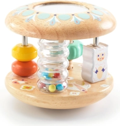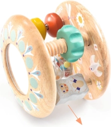 Baby Tutti je premyslená drevená hračka, ktorá sa ľahko uchopuje, príjemne hrká a po položení sa kotúľa. Deti zaujme farebný presyp korálikov v priehľadnom tubuse, malé zrkadielko na prvé objavovanie a posuvné krúžky na tyčkách. Hračka podporuje koordináciu ruka–oko a motivuje k plazeniu a otáčaniu.