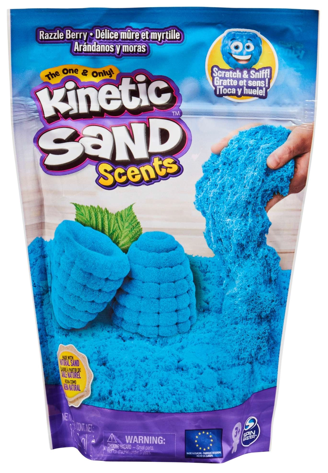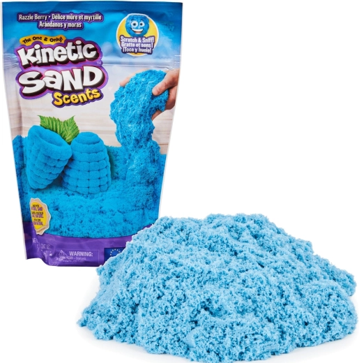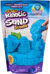 KINETIC SAND SCENTS v prevedení čučoriedka ponúka jedinečný zmyslový zážitok: jemný modrý piesok s príjemnou vôňou, ktorý sa nelepí, nerozsypáva a ľahko sa upratuje. Vďaka špeciálnym kinetickým vlastnostiam sa zrnká priťahujú, takže modelovanie je čisté a zábavné.