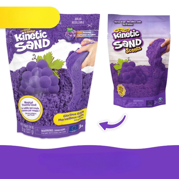 Kinetic Sand Scents prináša zmyslový zážitok: jemný, tvarovateľný piesok s príjemnou vôňou hrozna, ktorý si deti zamilujú. Špeciálne zloženie udržiava zrnká pri sebe, takže sa piesok menej sype a práca s ním je čistá a pohodlná. Ideálny na kreatívne hranie doma – formujte písmenká, stavby, bábovky aj fantazijné výtvory.