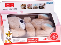 Upokojte svoje bábätko s hebkou vydrou, ktorá jemne „dýcha“, svieti na brušku a prehráva melódie, tlkot srdca aj biely šum. Táto interaktívna plyšová hračka vytvára pocit bezpečia a pomáha deťom rýchlejšie zaspať vďaka rytmickému pohybu bruška, zjemnenému svetlu a až 8 upokojujúcim zvukom. Mechanizmus ľahko vyberiete a plyš možno prať v práčke.