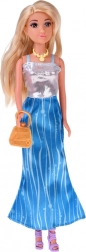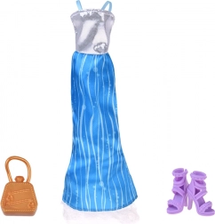 Večerná róba je inšpirovaná hladinou vody – striebristý živôtik pripomína odlesky slnka a dlhá modrá sukňa s vlnkovým vzorom evokuje morské vlny. Štýl dopĺňajú lodičky na opätku, náhrdelník a kabelka, aby bola princezná alebo víla vždy dokonale pripravená na ples aj podmorské dobrodružstvá.