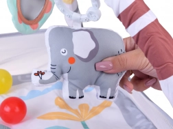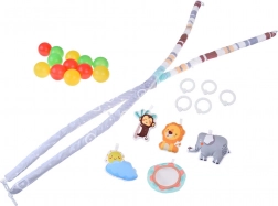 mäkká podložka, 2 flexibilné oblúky, závesné hračky (zrkadielko, slniečko s obláčikom, lev, slon, opička), 12 ks farebných loptičiek (Ø cca 5,5 cm)
