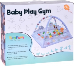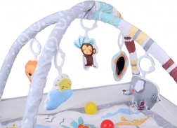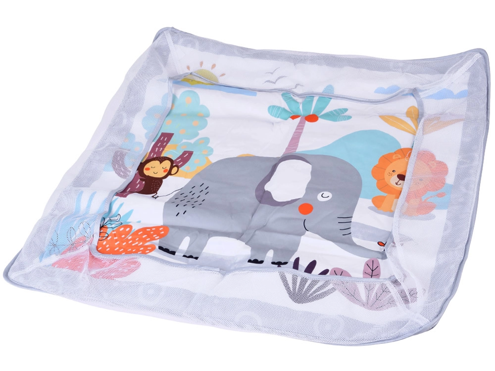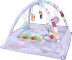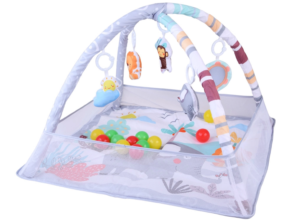 Roztomilá edukačná hracia podložka pre bábätká ponúka mäkké pohodlie, bezpečnú ohrádku zo sieťoviny a dva odnímateľné oblúky so závesnými hračkami. Podporuje zmyslový rozvoj, jemnú aj hrubú motoriku a motivuje k hre na brušku. Farebné plastové loptičky, plyšové zvieratká a detské zrkadielko zabavia bábätko doma aj na cestách.