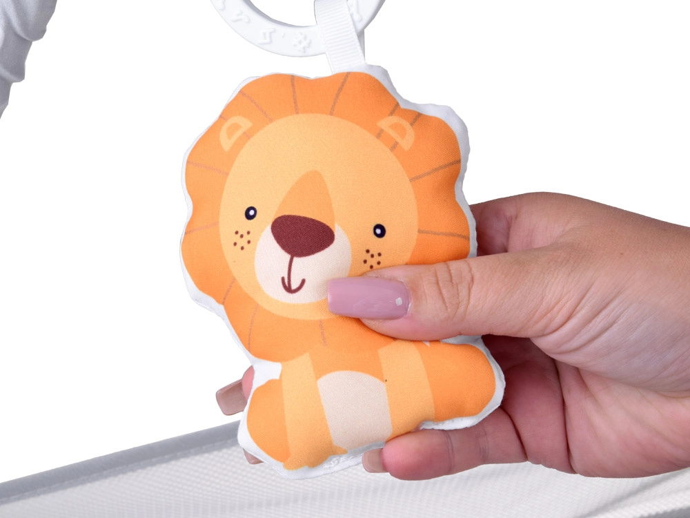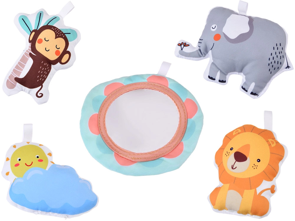 - závesné hračky vrátane zrkadielka, slniečka s obláčikom a zvieratiek (lev, slon, opička)