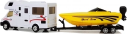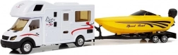 Tento štýlový karavan so žltým motorovým člnom je ideálny pre malých vodičov a milovníkov vody. Vďaka zotrvačníkovému pohonu stačí voz jemne natiahnuť dozadu a pustiť – vozidlo samo uháňa vpred. Realistické detaily ako sedadlá a volant podnecujú predstavivosť a rozvíjajú rozprávanie príbehov.