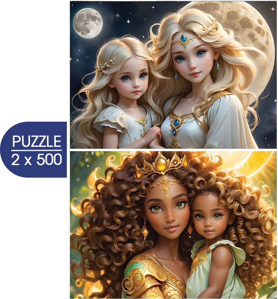 Užite si relax s elegantnou sadou dvoch puzzle po 500 dielikoch s motívom matky a dcéry inšpirovaným symbolom mesiaca a slnka. Ideálne pre milovníkov umeleckých ilustrácií, kvalitného spracovania a pohodových chvíľ doma.