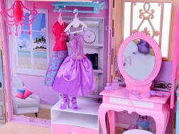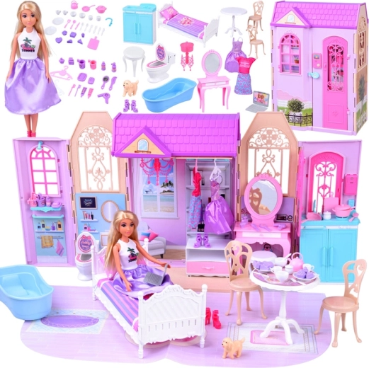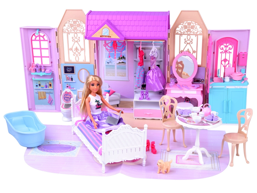 Skladací ružovo‑fialový domček je navrhnutý ako praktický kufrík, ktorý deti ľahko vezmú do škôlky, na prázdniny aj k priateľom. Po rozložení vytvorí útulný mini domov s tromi plne vybavenými zónami: kúpeľňou na dlhé kúpele, spálňou s toaletným stolíkom na styling a oddych a kuchyňou – srdcom každého domčeka.