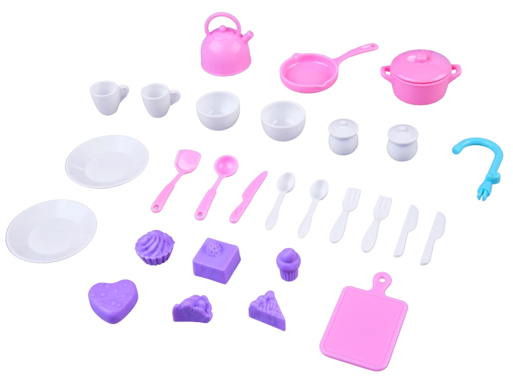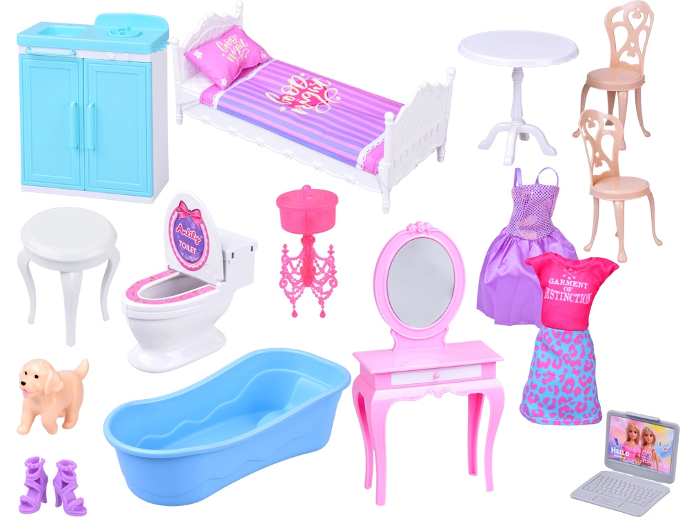 • Veľká sada doplnkov – oblečenie, topánky, riad, kozmetické a vlasové doplnky, laptop aj figúrka psíka.