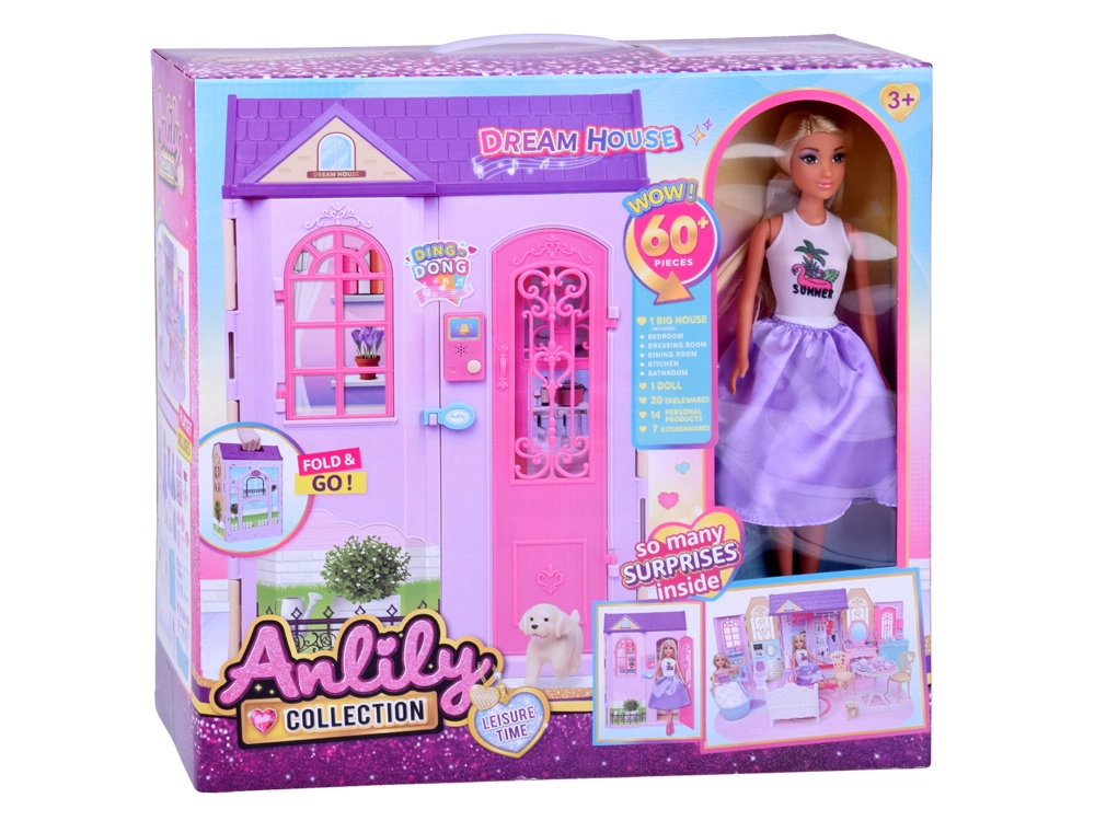 Skladací domček‑kufrík, bábika ANLILY, vaňa, WC, posteľ s obliečkami, komoda so zásuvkami, vešiak na oblečenie, toaletný stolík a stolička, kuchynský kút s drezom a varičom, okrúhly stôl, 2 stoličky, luster, figúrka psíka, podlaha (pevný plagát), 3 šaty, 2 páry lodičiek, 2 ramienka, ručné zrkadlo, hrebeň, fén, 2 flakóny parfumu, balzam, tuba krému, 2 tuby zubnej pasty, 2 kefky, mydlo s mydelničkou, 2 poháriky, laptop, hrniec s pokrievkou, panvica, kanvica, 2 taniere, 2 misky, 2 hrnčeky, 2 poháre, doska na krájanie, 2 sady príborov, naberačka, obracačka, nôž, sladké zákusky