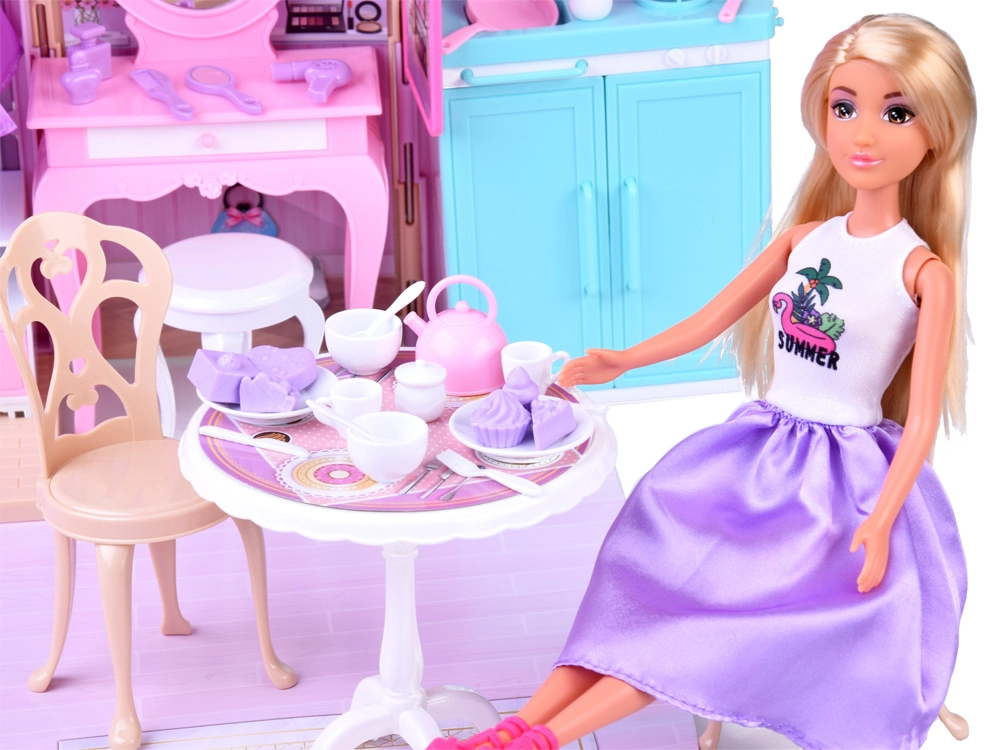Kúpeľňa, spálňa s toaletným stolíkom a kuchyňa tvoria kompletný domov pre bábiku. Otváracie dvere, okná a detailná dekorácia podporujú predstavivosť a realistické hranie.