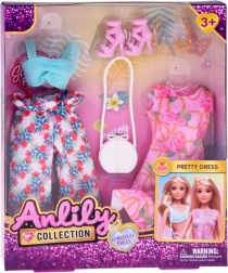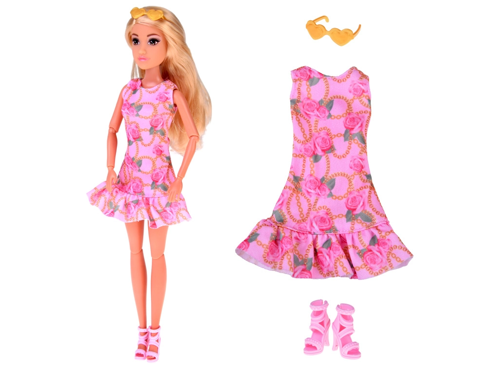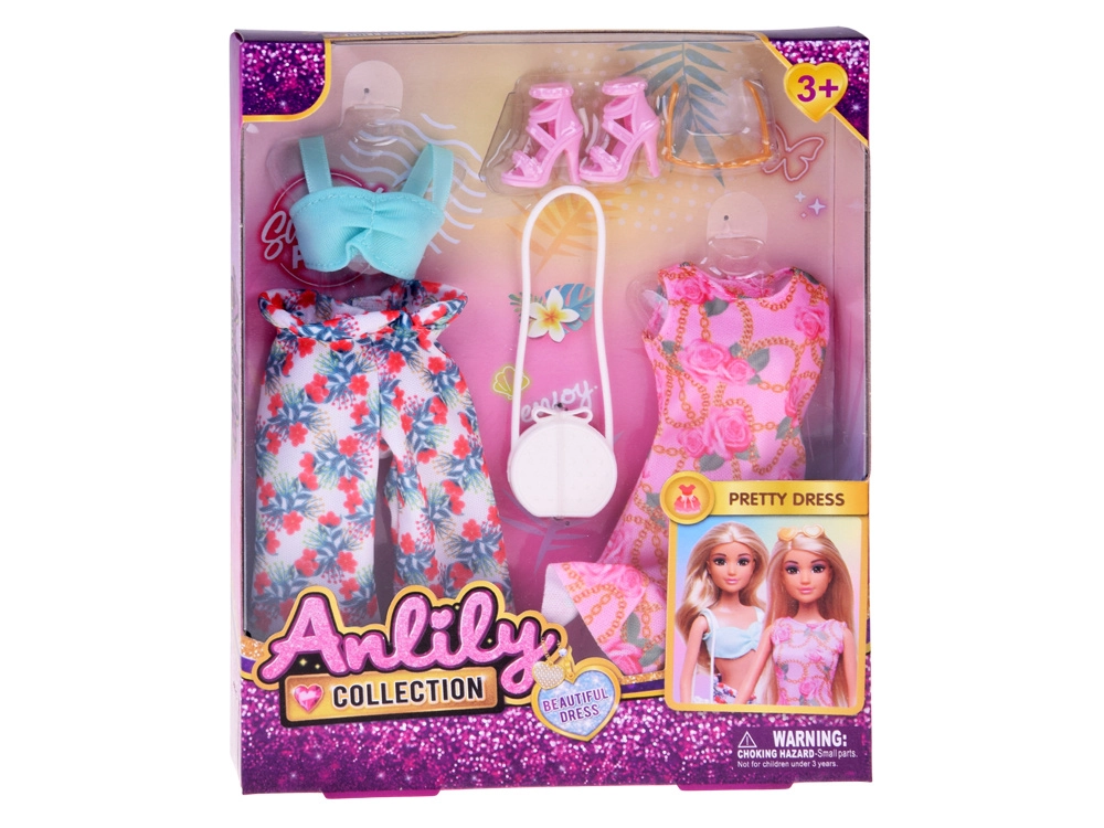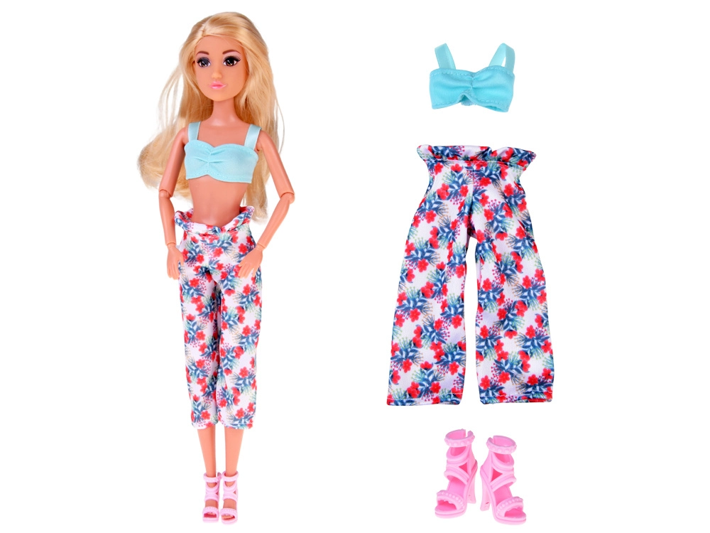 Rozžiarte štýlové hranie s pestrým setom oblečkov pre bábiku, ktorý prináša dve letné kombinácie a módne doplnky. Nájdete tu kvetinové šaty, tyrkysový crop top s kvetovanými nohavicami, k tomu ružové lodičky, slnečné okuliare v tvare srdca a ďalšie drobnosti pre mix & match styling a kreatívne módne hranie.