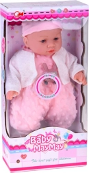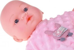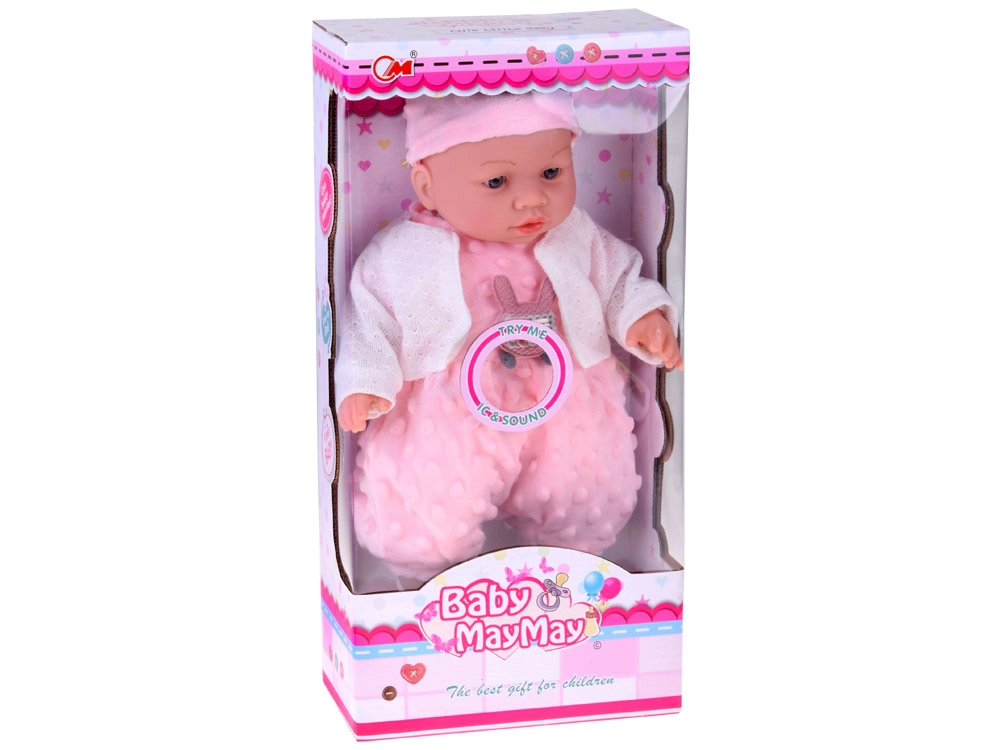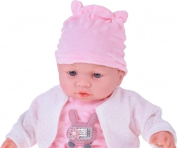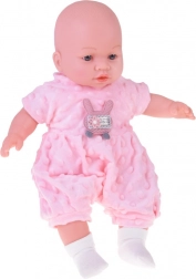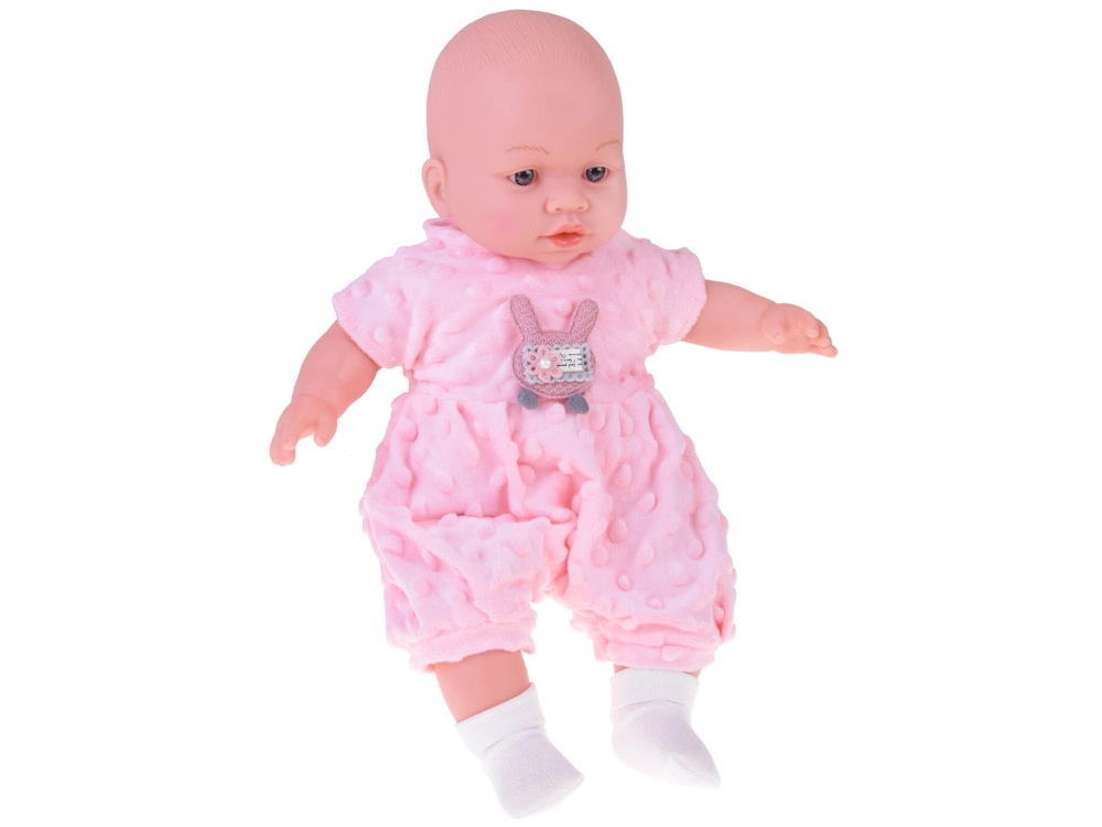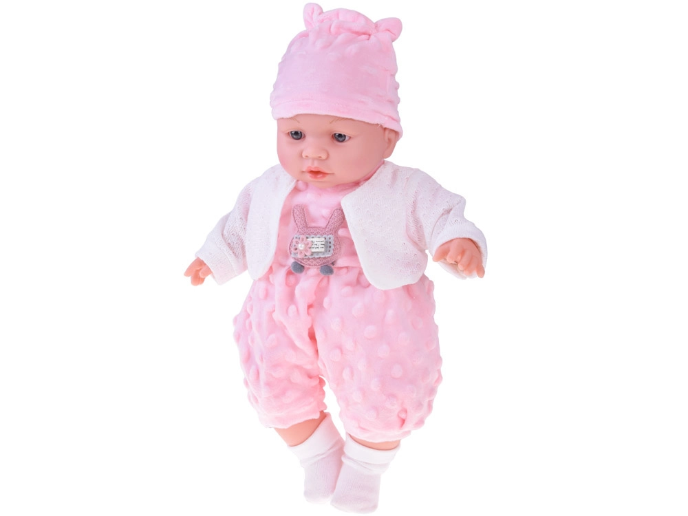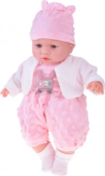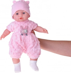 Roztomilé bábätko s výškou 40 cm poteší každé dieťa už od 12 mesiacov. Vďaka mäkkému textilnému telíčku je skvelé na maznanie, ľahké na nosenie a má realistické detaily tváre. Po stlačení bruška vydáva rôzne zvuky – žvatlá, smie sa, poplakáva a mrnčí. Súčasťou je hebký ružový rampers z minky s aplikáciou, čiapočka s uškami, biely kardigán a ponožky.