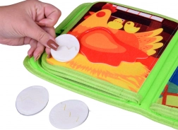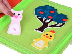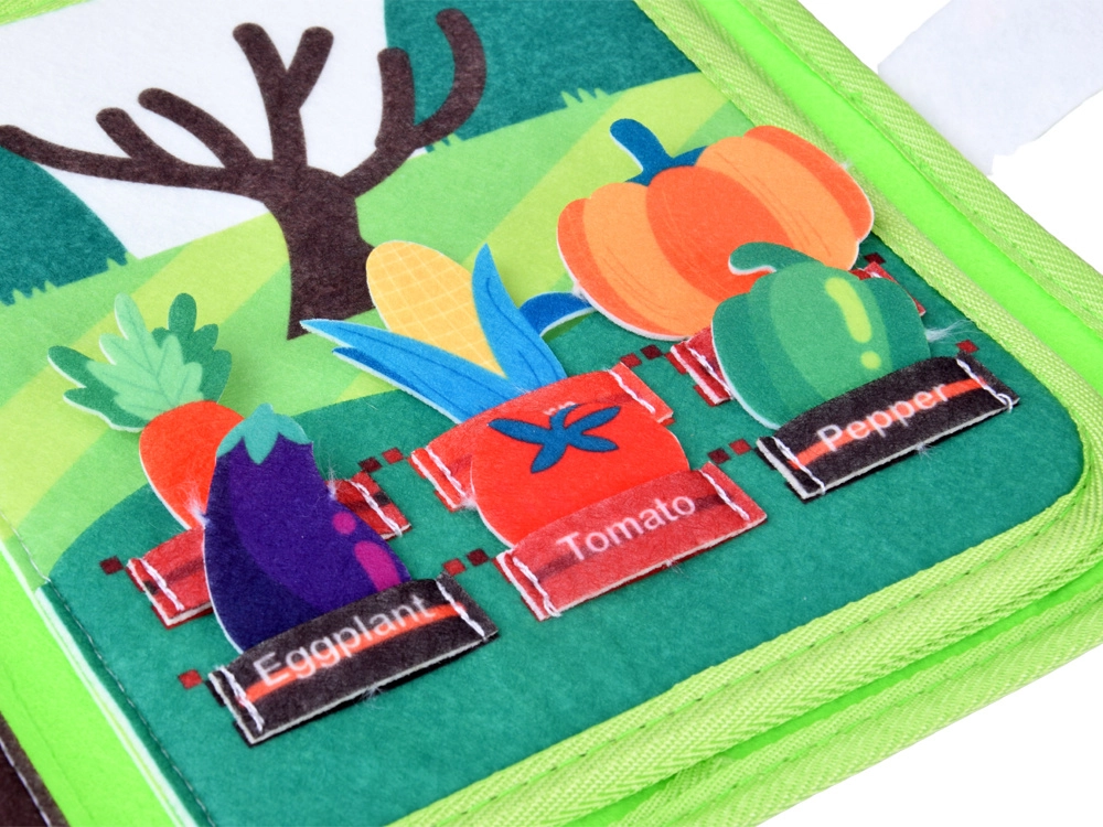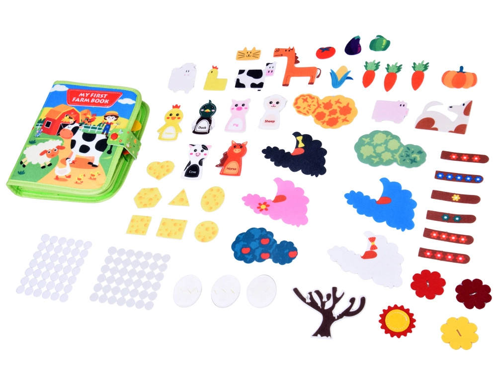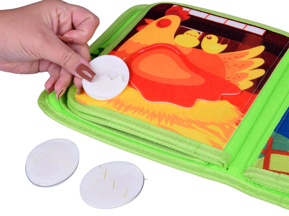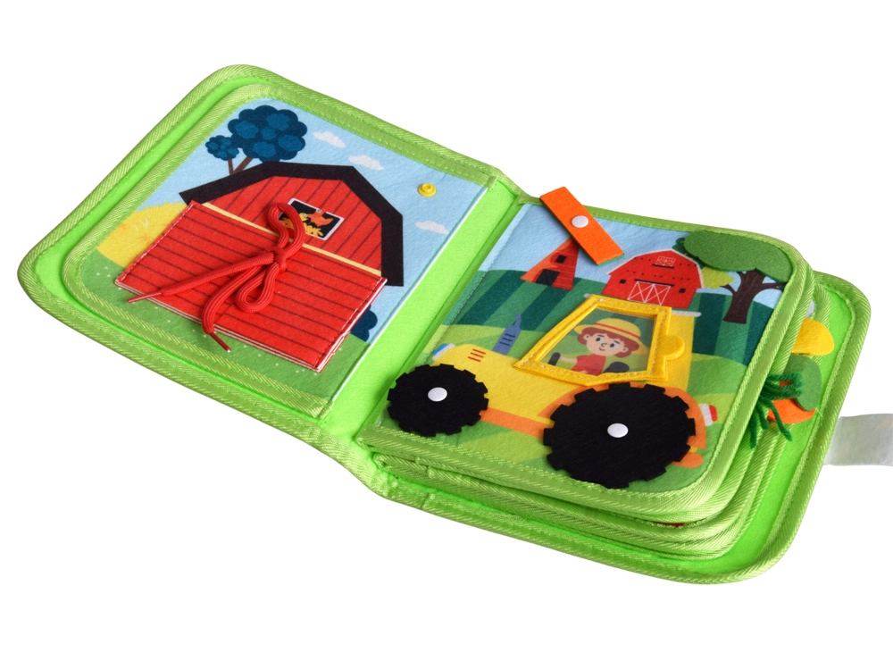 Táto textilná zmyslová knižka s farmárskou tematikou prináša deťom hodiny tvorivej zábavy. Na každej stránke čakajú zvieratká, zelenina, traktor a stodola, ktoré možno premiestňovať a kombinovať vďaka suchému zipsu. Deti môžu dvíhať okienka, otáčať kolesá traktora alebo zaväzovať šnúrku a objavovať, čo sa skrýva na statku.