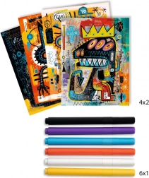 Súčasťou sady sú skicovacie bloky s originálnymi obálkami, rôzne motívy plagátov a výber farebných fixiek. To všetko podporuje fantáziu, rozvíja cit pre farby a kompozíciu a povzbudzuje k experimentom v duchu súčasného urban artu.