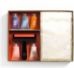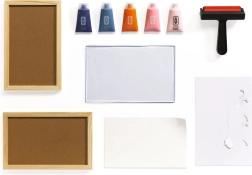 Všetko, čo potrebujete k prvému tlačeniu: gélová doska, brayer, farby, papiere a šablóny. Otvorte krabicu a tvoríte – bez ďalších pomôcok.