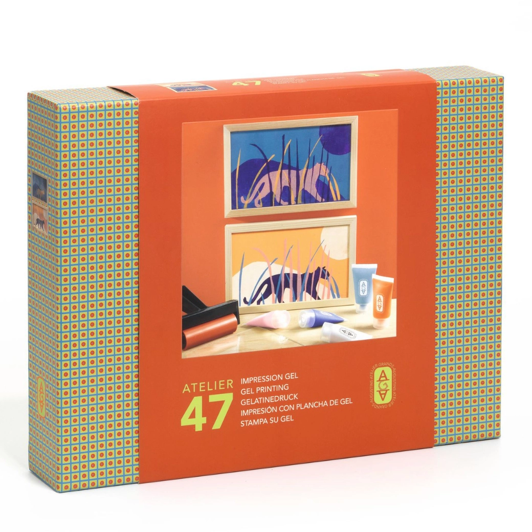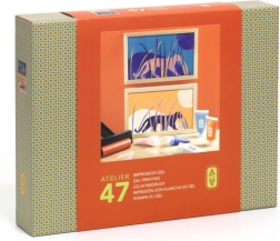 Sada na gélový tlač DJECO Atelier sprístupňuje populárnu techniku gelli printingu v domácich podmienkach. Na priehľadnú gélovú dosku nanesiete farbu, rozvalcujete ju brayerom a pomocou šablón vytvoríte jedinečné motívy. Potom stačí priložiť papier a preniesť odtlačok – každý tlač je originál.