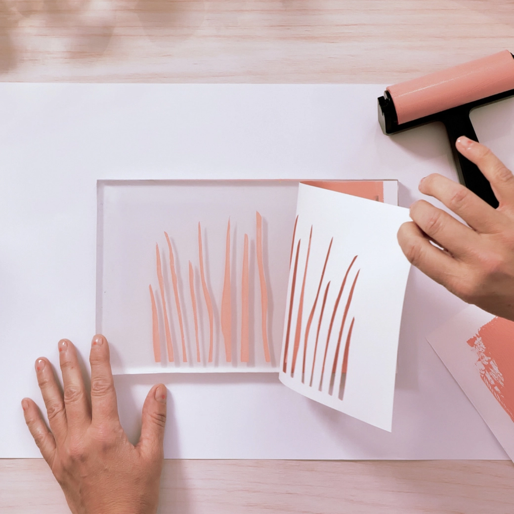 - Gélová tlačová doska, gumový valček (brayer), šablóny, farby, papiere
