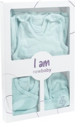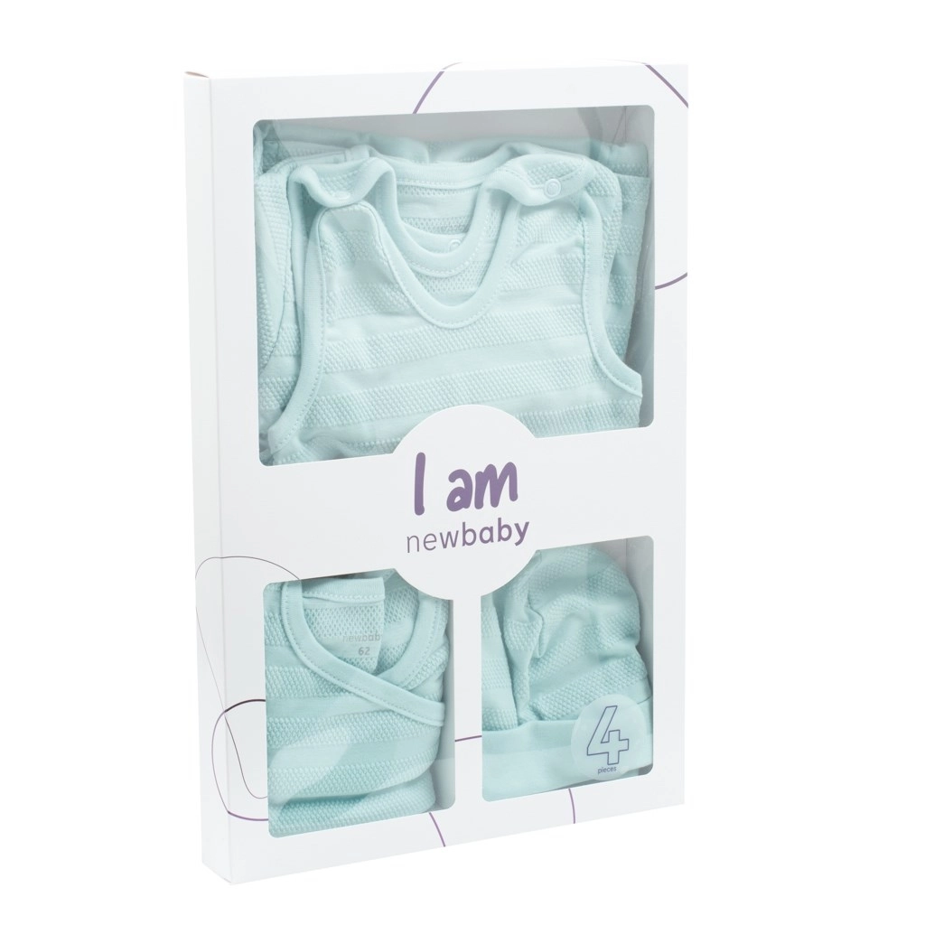 V balení nájdete zavinovacie body s dlhým rukávom, dupačky s krytými chodidlami, zapínací kabátik a čiapočku so širším lemom, ktorý dobre drží na hlavičke a netlačí. Celá kolekcia má decentný štruktúrovaný vzor a je dodaná v ekologickej darčekovej krabičke – skvelé riešenie ako darček pre čerstvých rodičov.