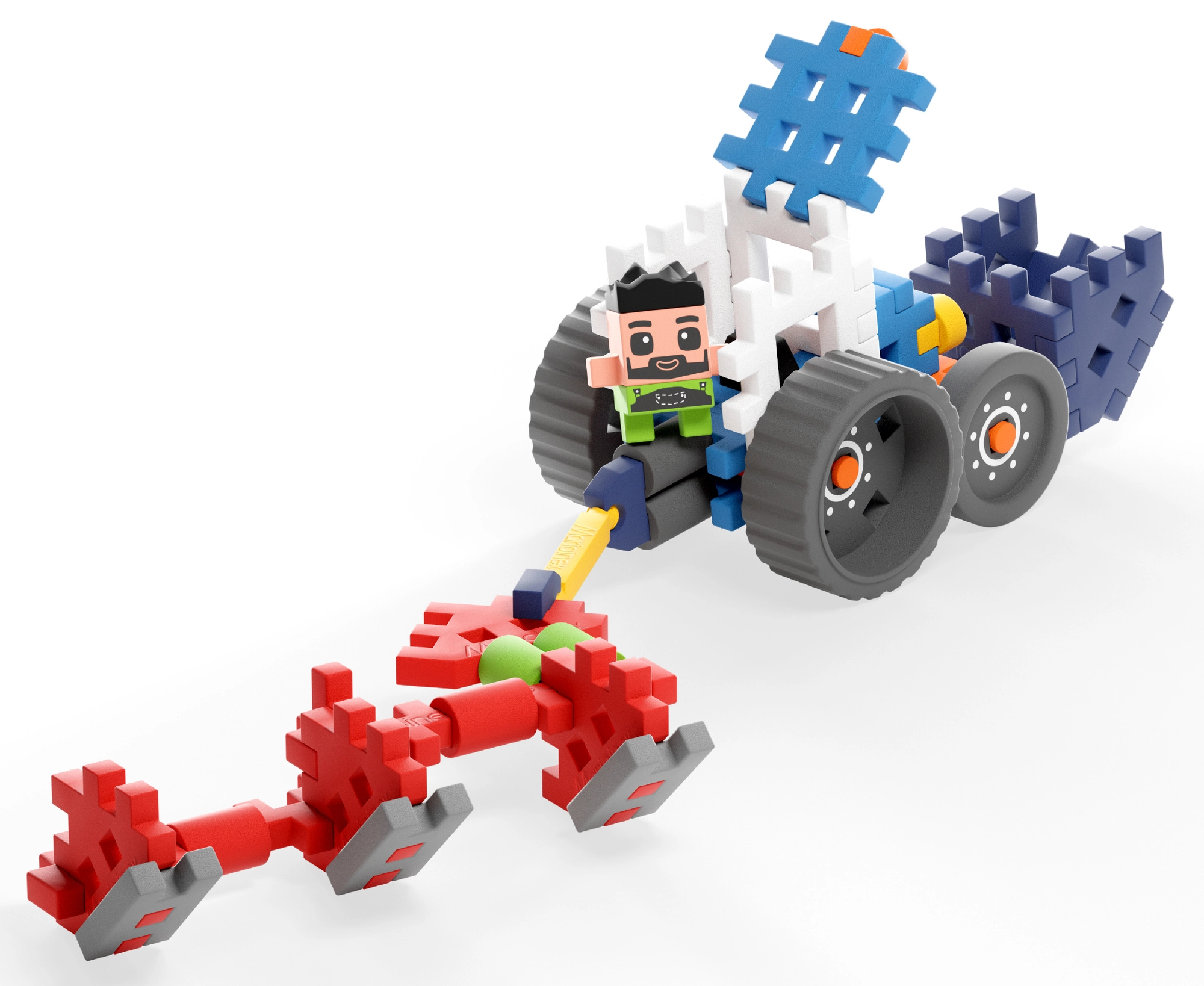 Súčasťou je aj figúrka farmára, ktorá doplní herné zážitky o role-play prvky. Deti si precvičia kreativitu, manuálnu zručnosť a logické myslenie, zatiaľ čo si užívajú zábavu s pojazdným traktorom a pripojiteľným pluhom.