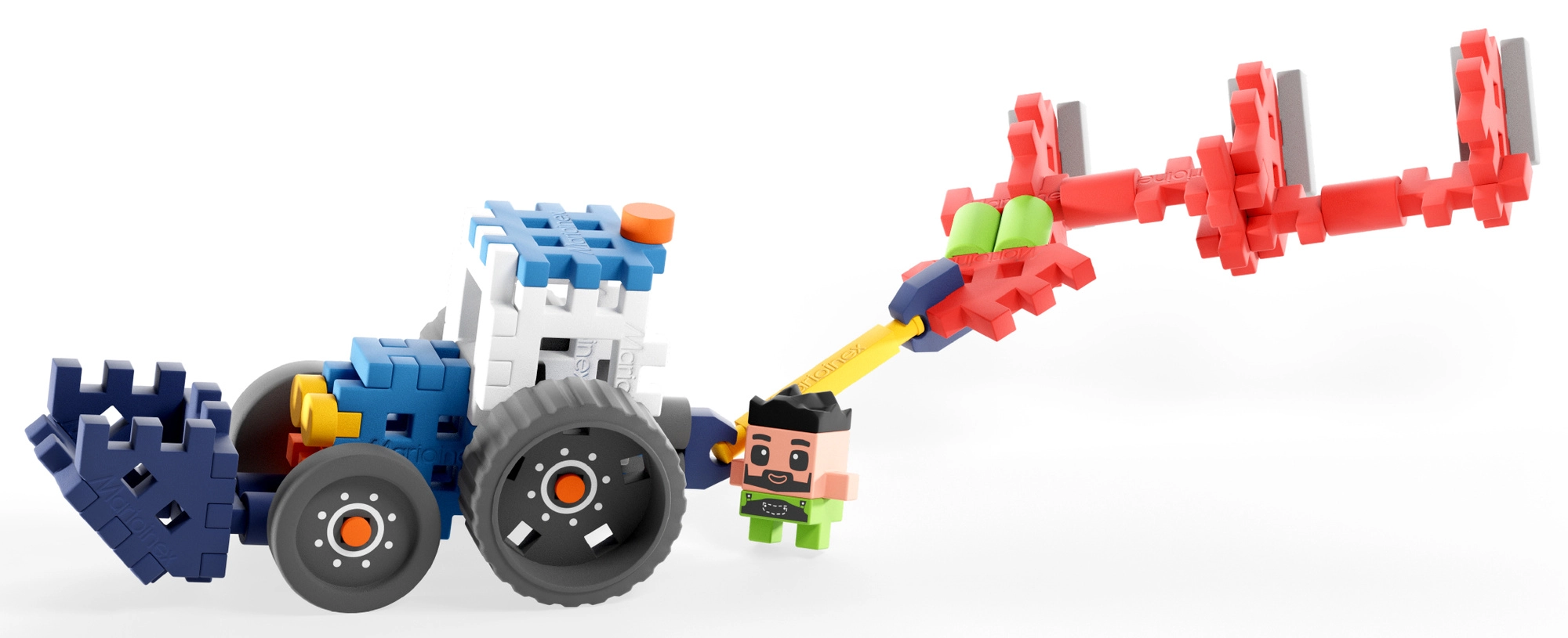 Z 50 farebných a pružných dielikov ľahko zostavíte traktor s prednou lopatou a zadným pluhom. Model je ideálny na hranie aj opakované prestavby.
