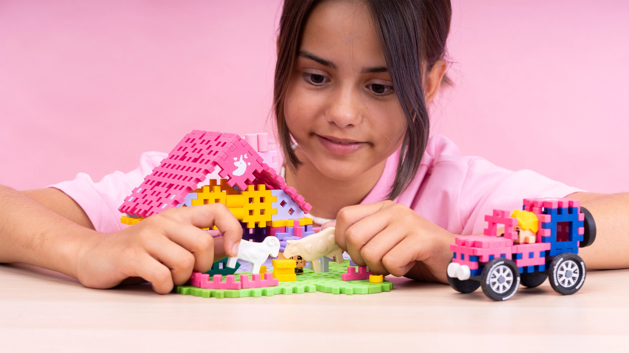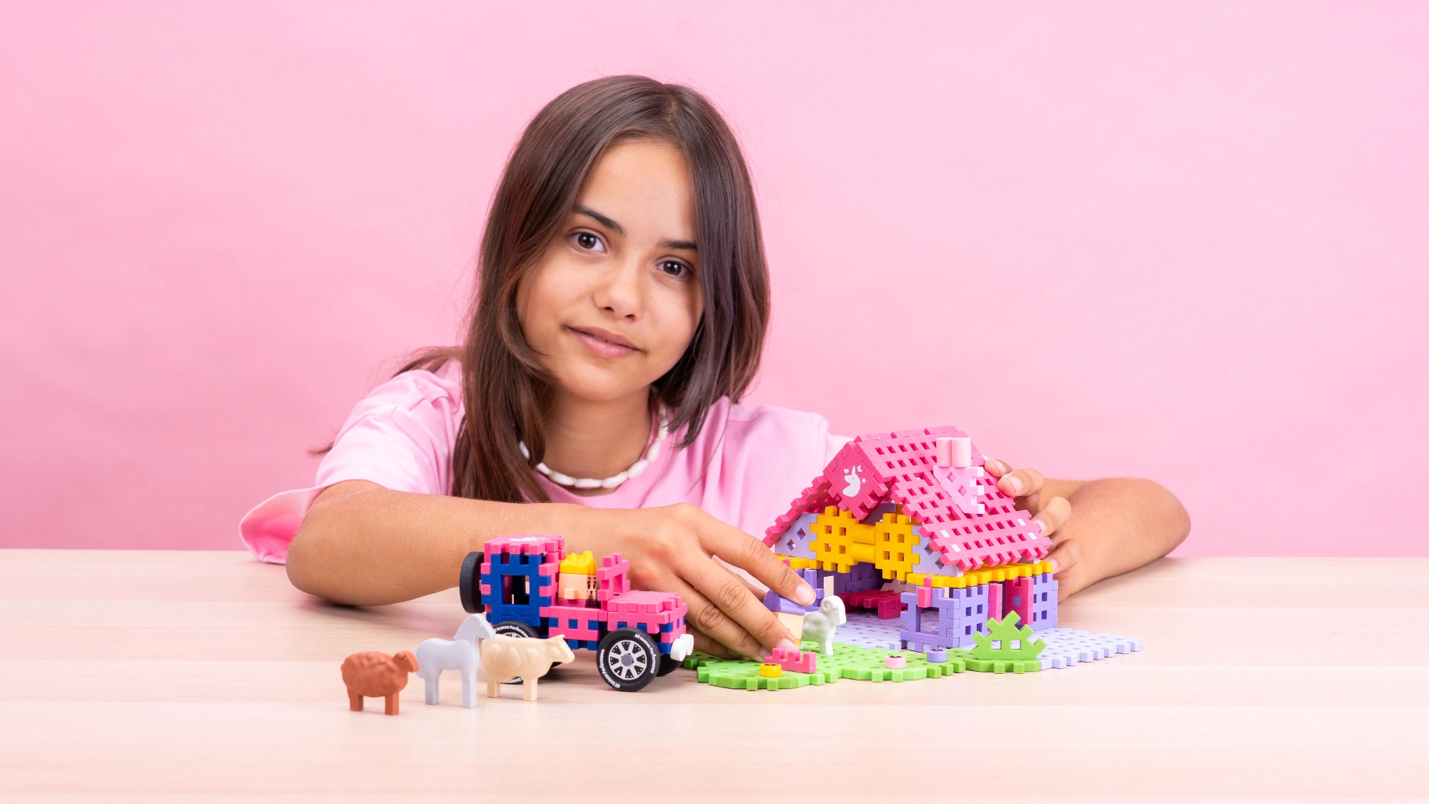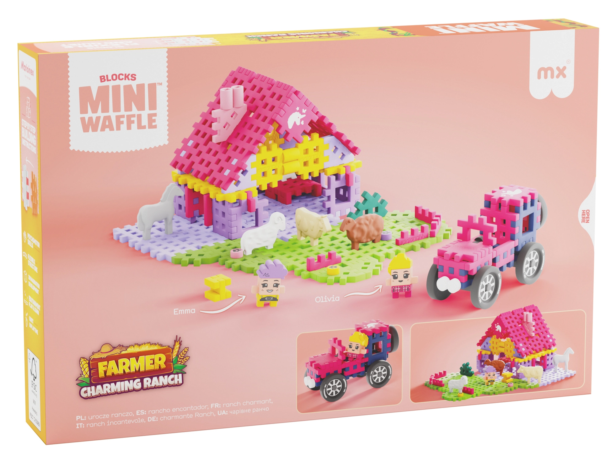 Domček, ohrady, zvieratká a detaily krajiny – všetko z farebných Mini Waffle dielikov, ktoré podporujú predstavivú hru a rozvoj fantázie.