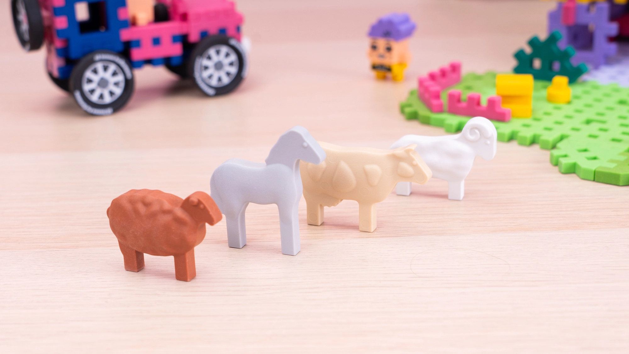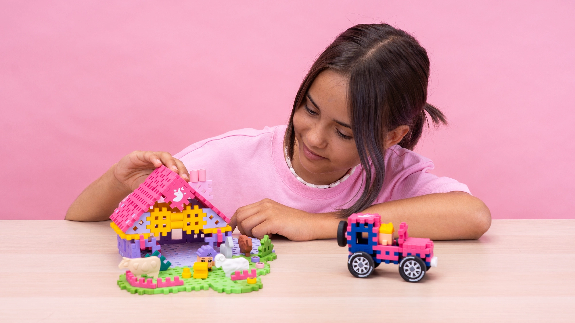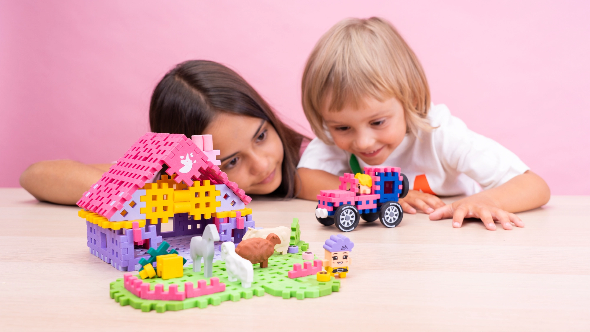 Domček, ohrady, zvieratká a detaily krajiny – všetko z farebných Mini Waffle dielikov, ktoré podporujú predstavivú hru a rozvoj fantázie.