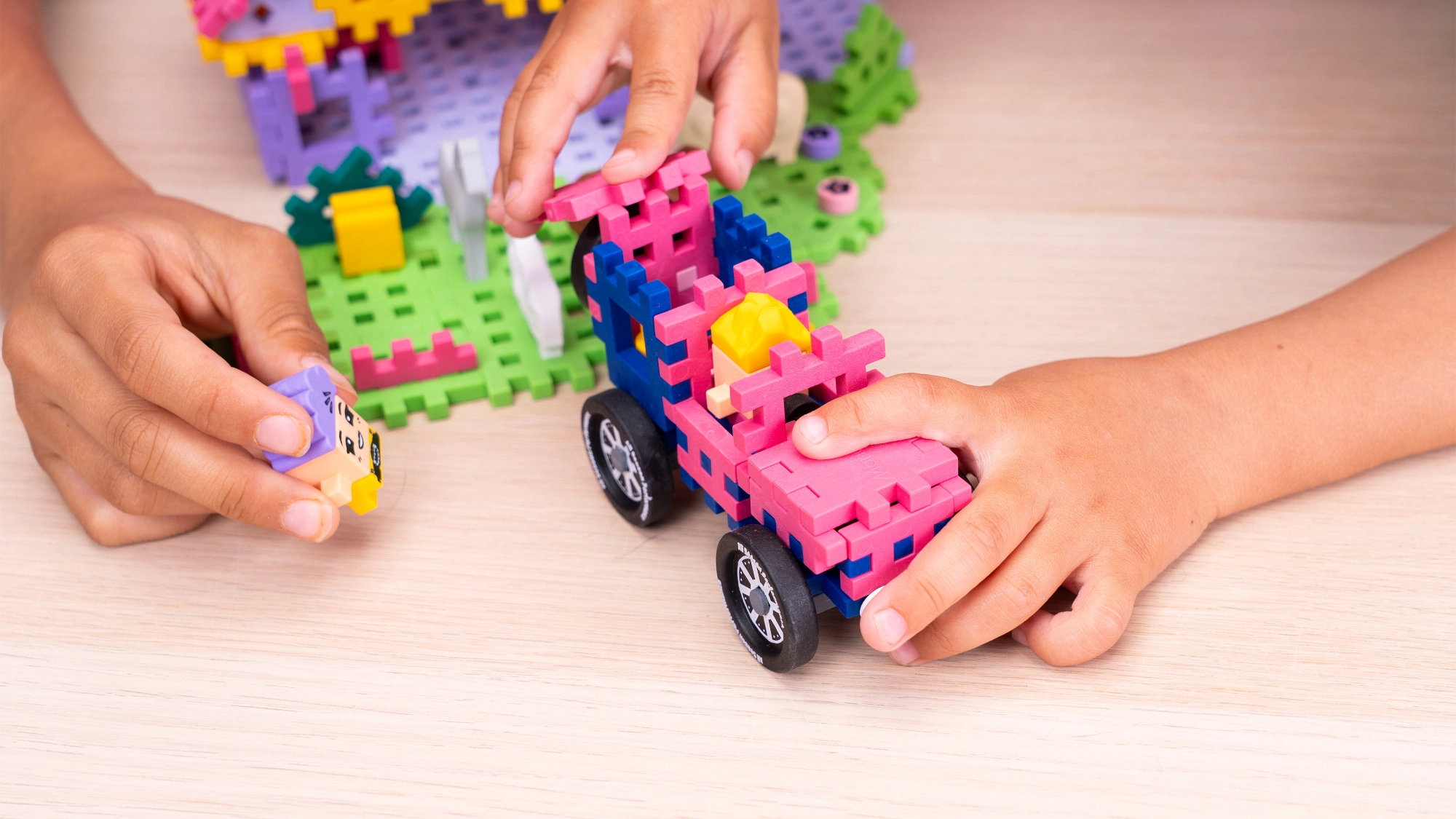 Poskladajte štýlové autíčko a užite si plynulú jazdu vďaka kolieskam. Deti môžu prevážať figúrky aj úrodu po celej farme.