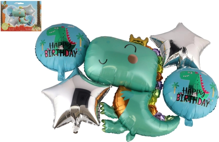 - 5 ks balónikov (dinosaurus s korunkou, 2× guľatý Happy Birthday, 2× hviezda)