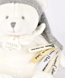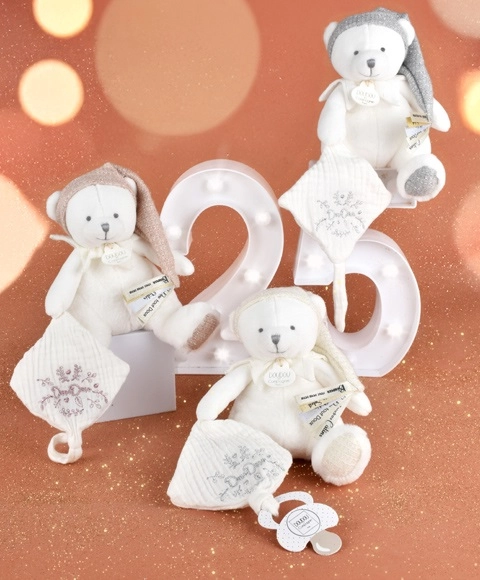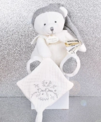 Táto elegantná darčeková sada spája pohodlie a funkčnosť v jednom. Hebký medvedík s čiapočkou a golierikom má k labke prišitú mäkkú dečku, ktorá upokojuje a podporuje jednoduchšie zaspávanie. Na konci dečky je praktický úchyt na cumlík, vďaka ktorému zostane cumlík vždy čistý a ľahko dostupný.