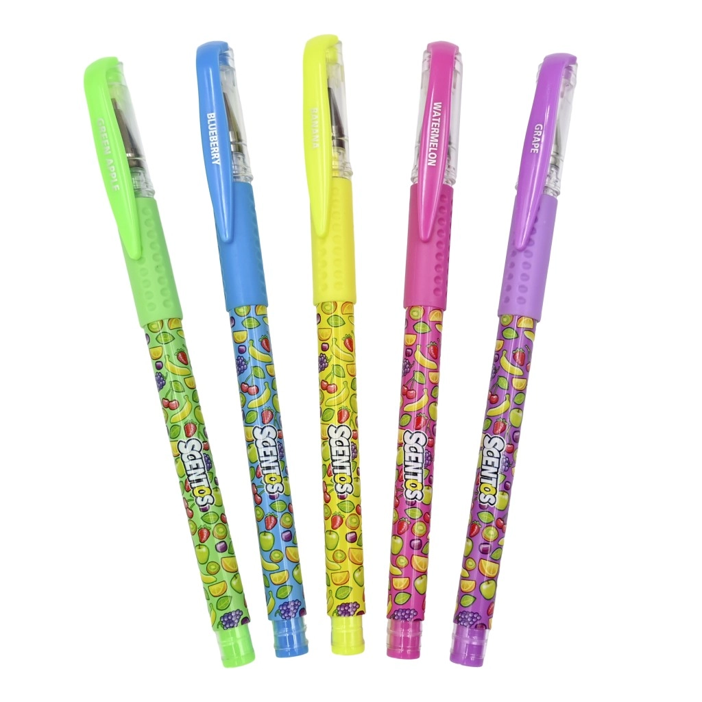 V balení nájdete päť vôní a farieb: zelená (green apple), modrá (blueberry), žltá (banana), ružová (watermelon) a fialová (grape). Perá sú vyrobené z netoxických materiálov a spĺňajú nároky na bezpečné školské potreby.
