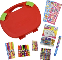 Vo vnútri nájdete bohatú sadu kreatívnych potrieb v pestrých farbách: voňavé fixky, voňavé pastelky, voskovky, omaľovánky s veselými postavičkami a farebné nálepky na dotvorenie výtvorov. Všetko je navrhnuté tak, aby bolo netoxické, pohodlné do detskej ruky a motivovalo k rozvoju fantázie aj jemnej motoriky.