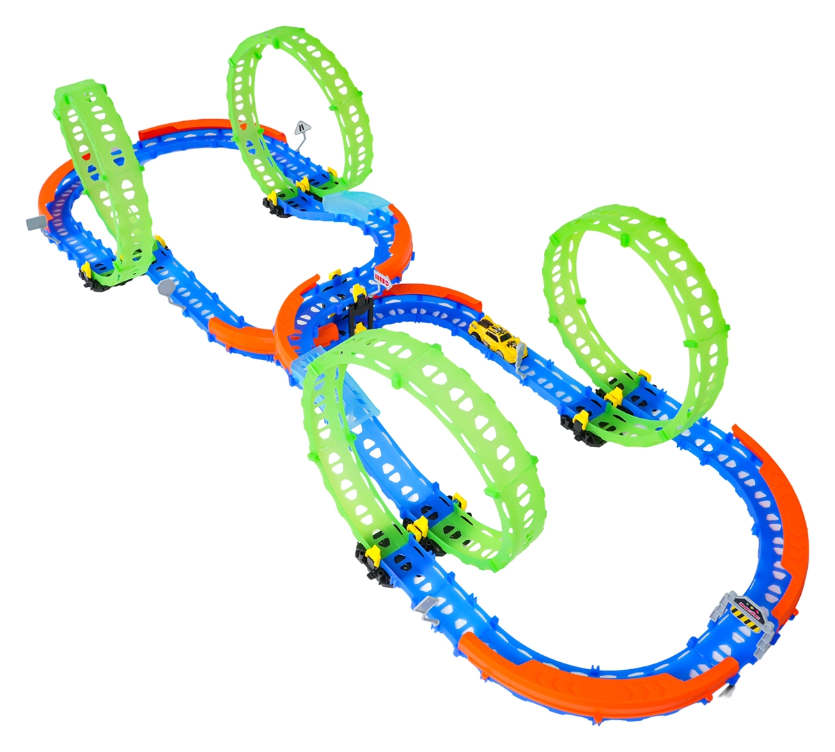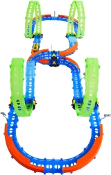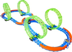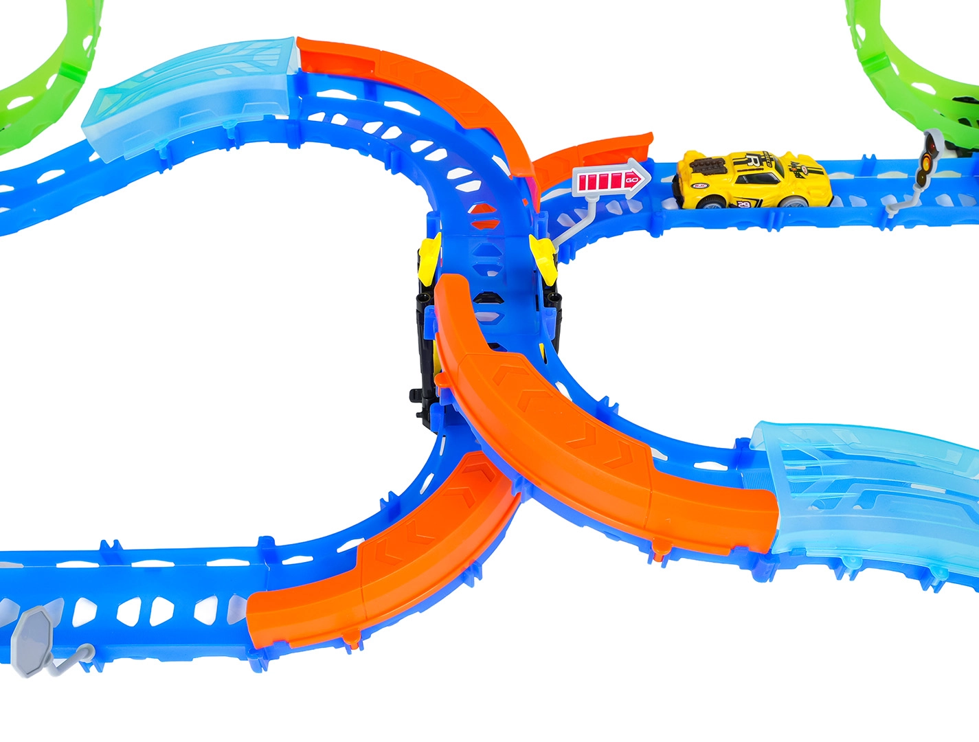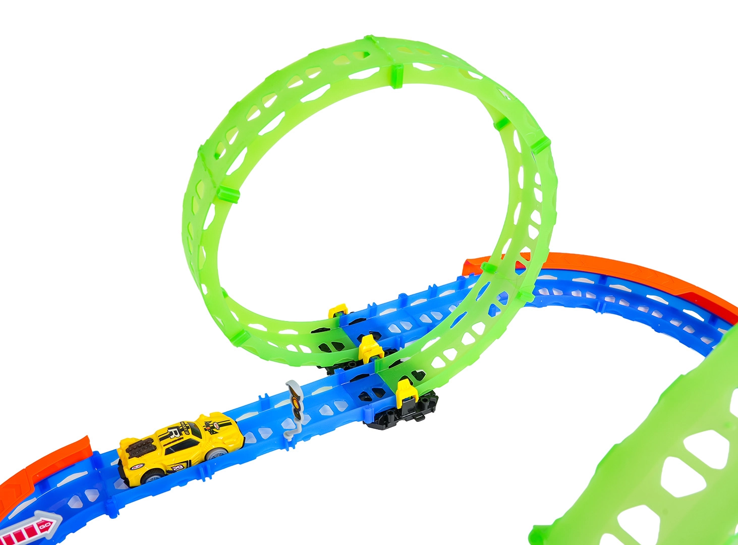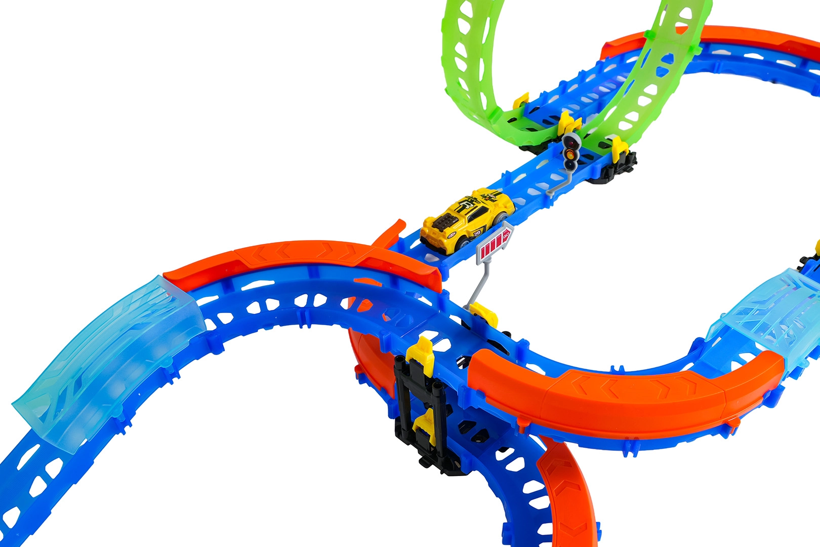 Táto farebná pretekárska dráha ponúkne parádne kaskadérske jazdy aj kreatívne stavanie. Vďaka fluorescenčným slučkám a svetelnému efektu autíčka vynikne najmä v tme, kde sa premení na žiarivú trasu plnú napätia. Robustné zábradlia v zákrutách pomáhajú udržať autíčko bezpečne na trati.