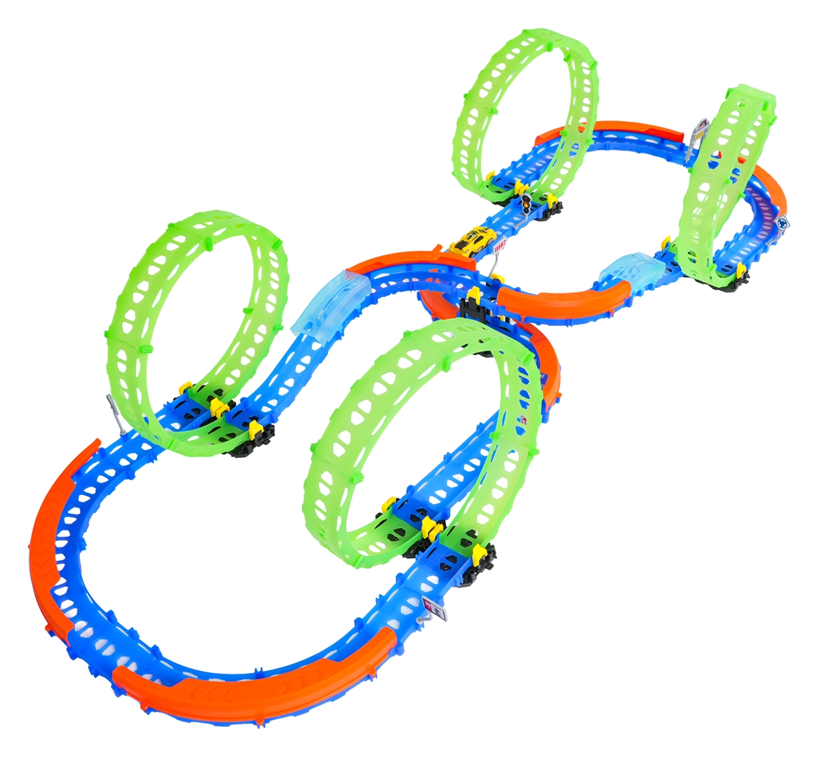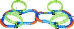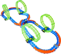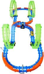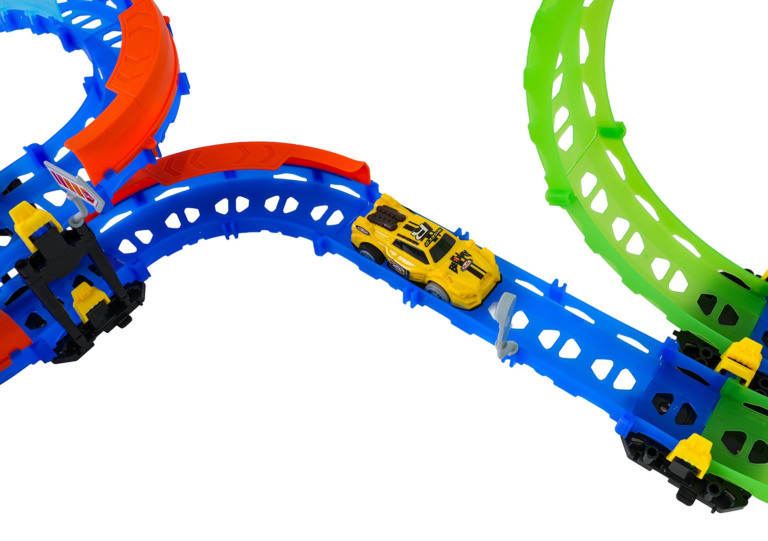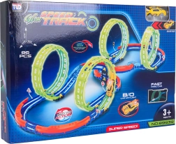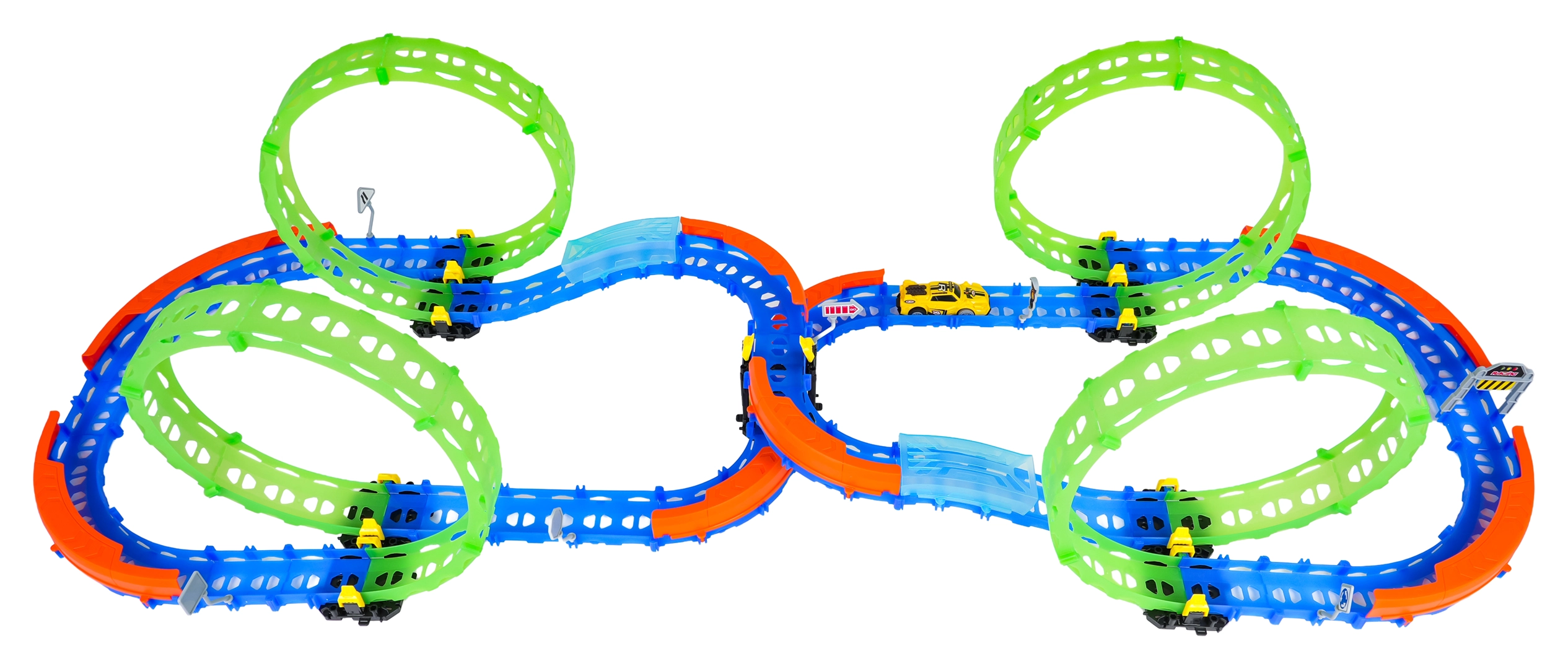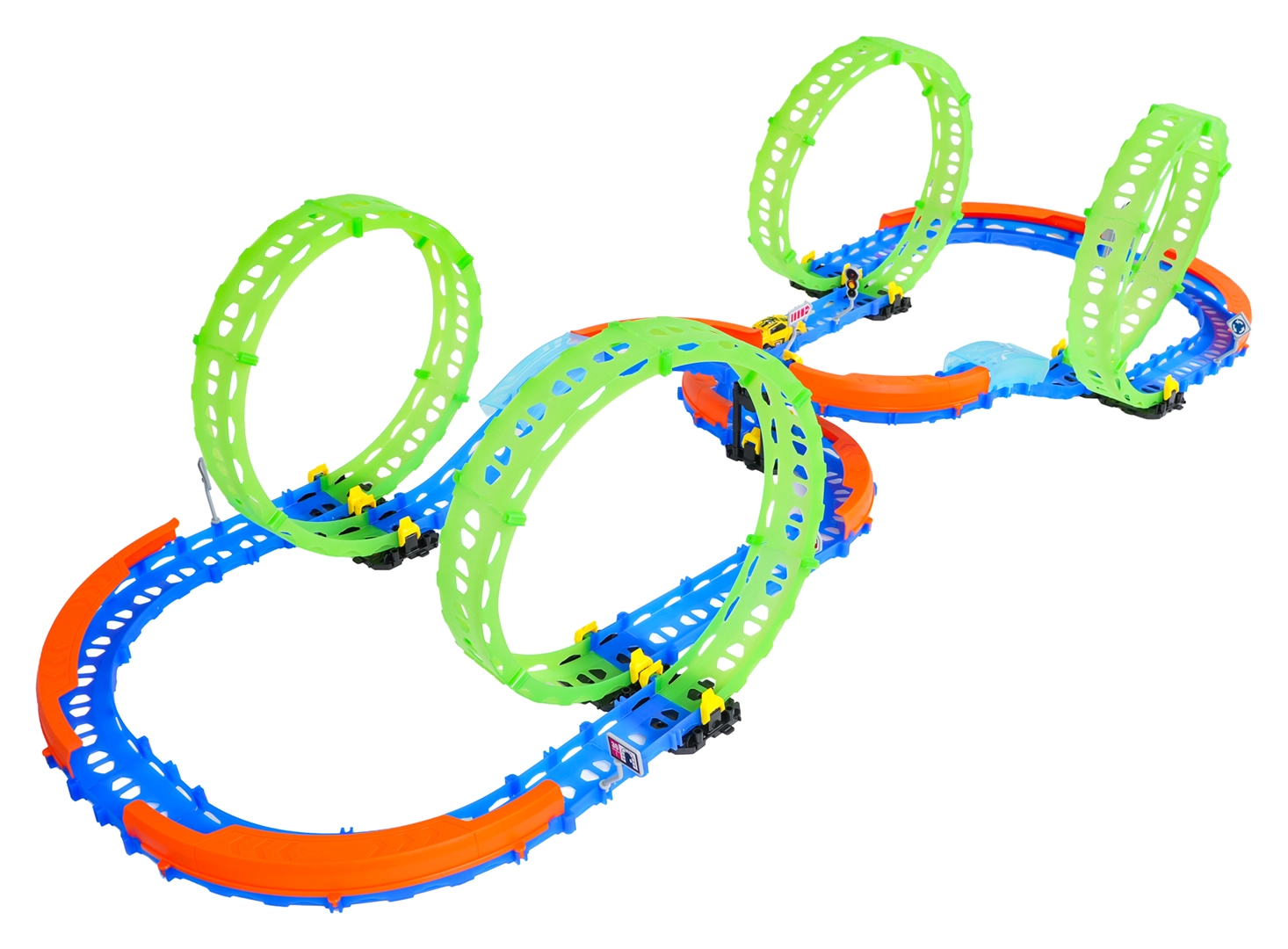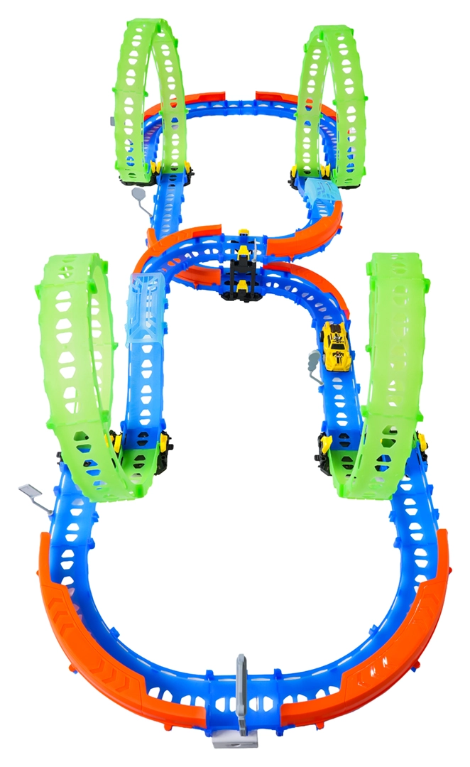 Táto farebná pretekárska dráha ponúkne parádne kaskadérske jazdy aj kreatívne stavanie. Vďaka fluorescenčným slučkám a svetelnému efektu autíčka vynikne najmä v tme, kde sa premení na žiarivú trasu plnú napätia. Robustné zábradlia v zákrutách pomáhajú udržať autíčko bezpečne na trati.