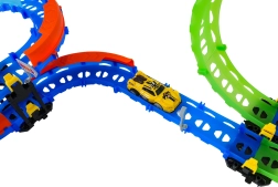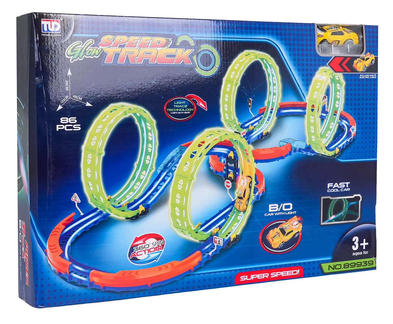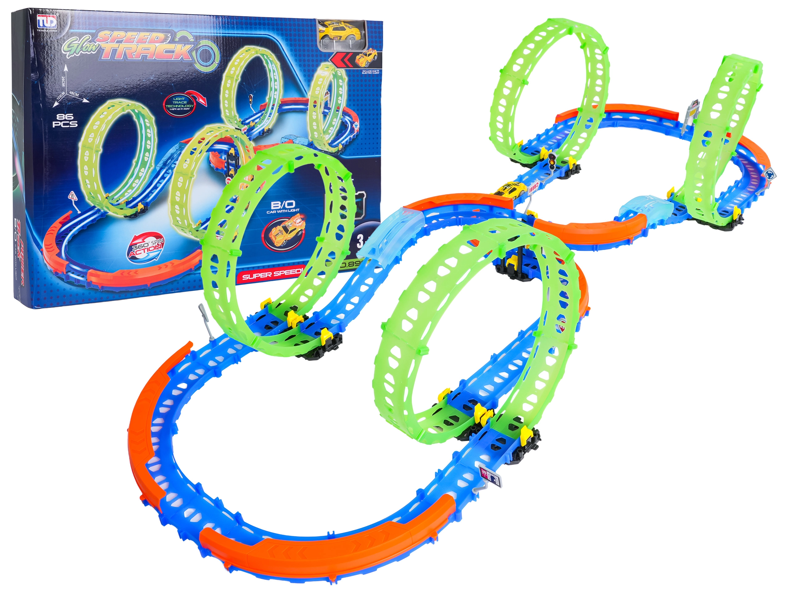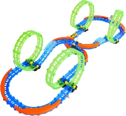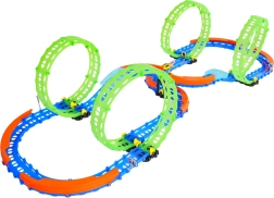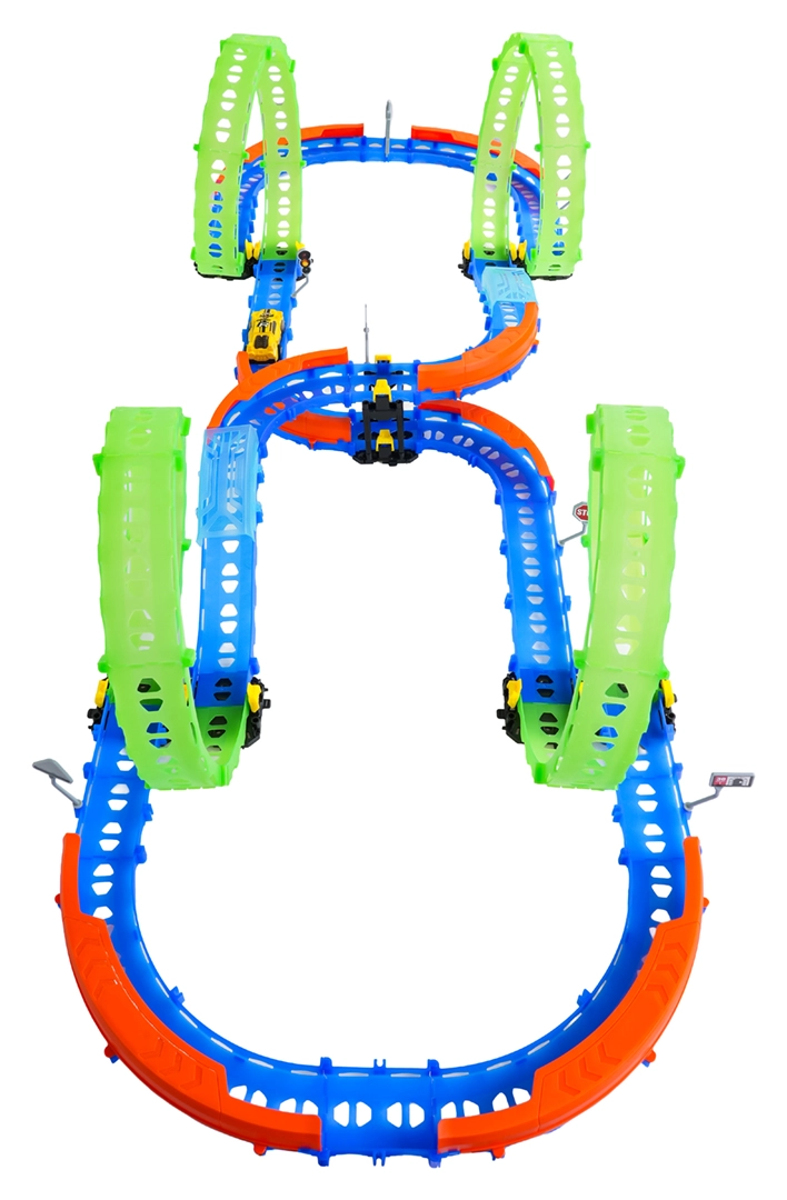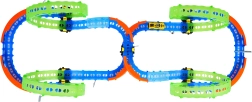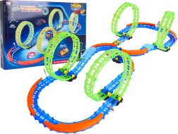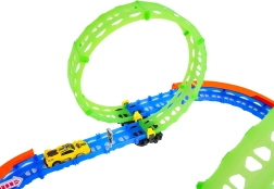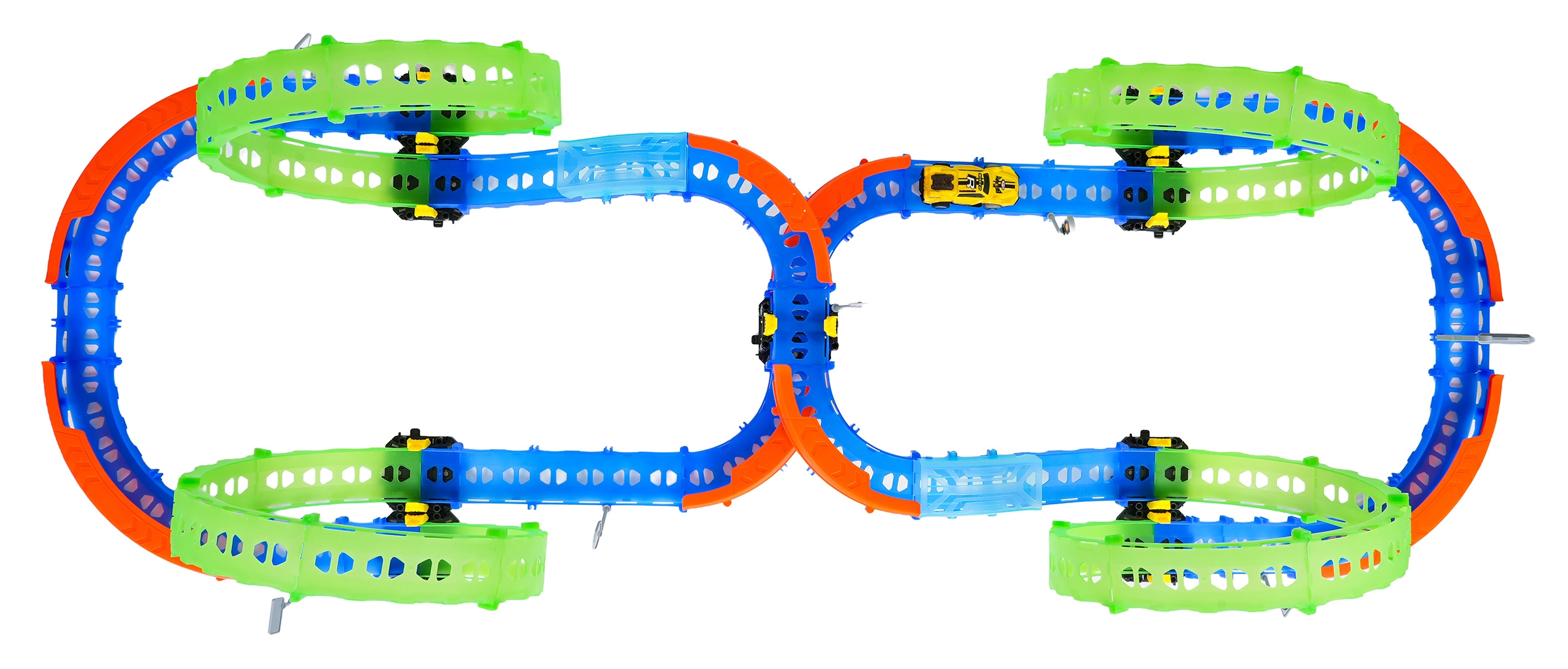Táto farebná pretekárska dráha ponúkne parádne kaskadérske jazdy aj kreatívne stavanie. Vďaka fluorescenčným slučkám a svetelnému efektu autíčka vynikne najmä v tme, kde sa premení na žiarivú trasu plnú napätia. Robustné zábradlia v zákrutách pomáhajú udržať autíčko bezpečne na trati.