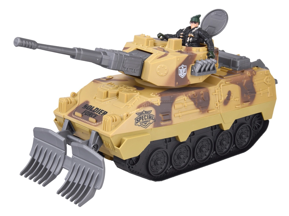 Detailný tank v púštnom maskovaní má otočnú vežu, zdvíhacie delo, otvárací poklop pre figúrku a prednú radlicu na „čistenie“ prekážok. Perfektný pre realistické manévre.