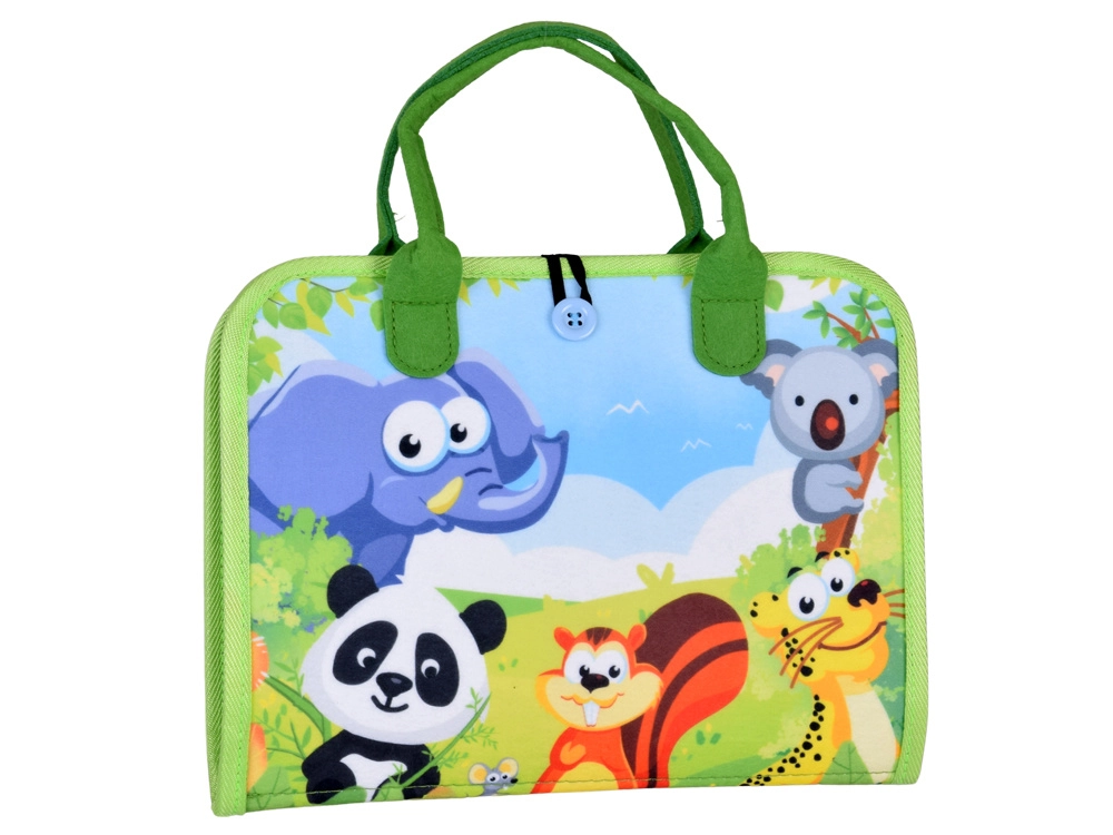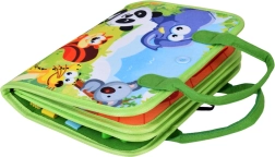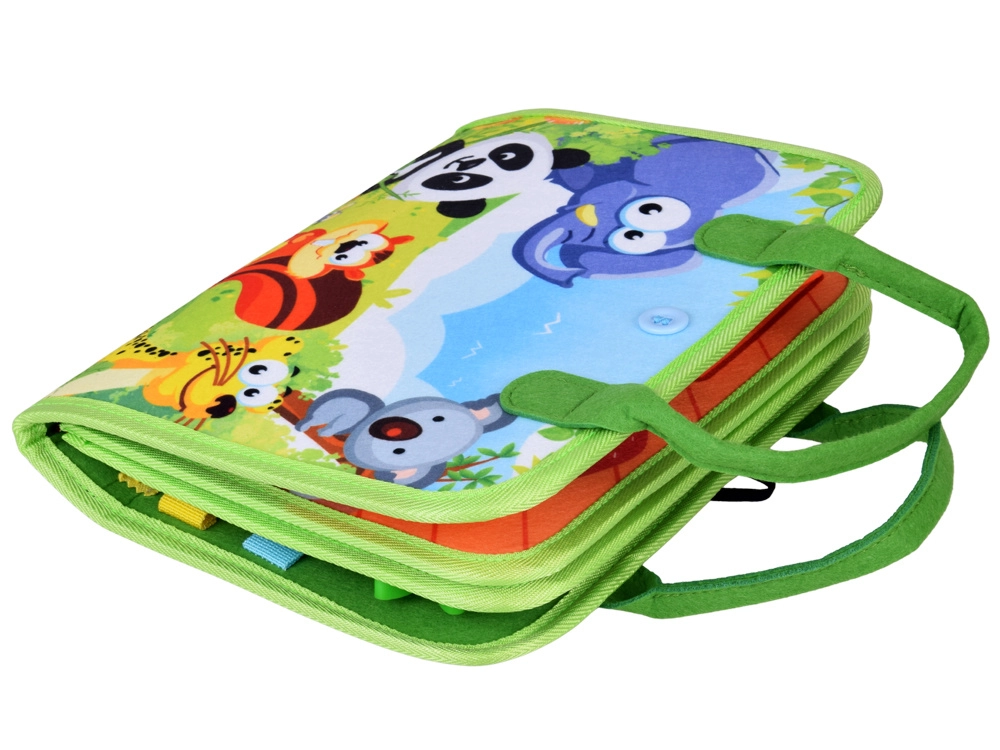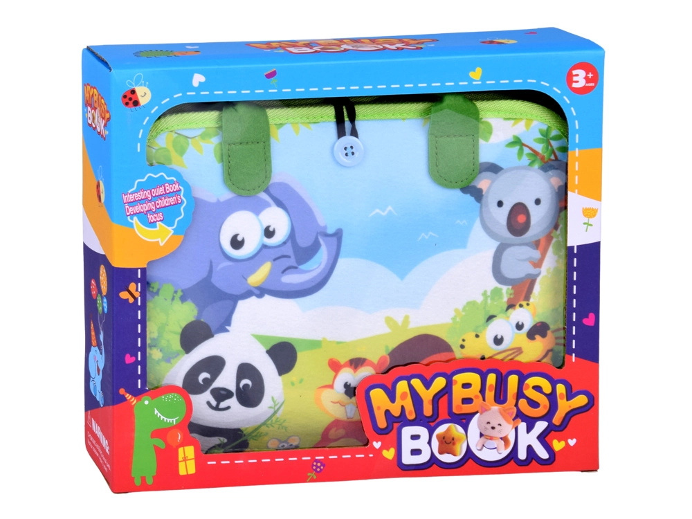 Obsah zahŕňa scénky na obliekanie (zapínanie, rozopínanie, viazanie), detskú izbu so skriňou na oblečenie, kuchyňu s potravinami, záhradku s triedením ovocia a zeleniny na suchý zips a stránku na precvičenie prštekov. Mäkké materiály a bezpečné prvky zaisťujú tichú a pokojnú zábavu doma aj na cestách.
