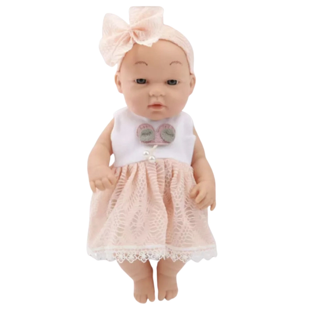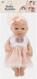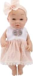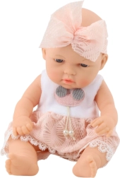 Táto bábika bábätko očarí elegantnými ružovými šatami s čipkovým lemom a zladenou čelenkou s veľkou mašľou. Jemné črty tváre a príjemné materiály vytvárajú dojem skutočného bábätka, ktoré si deti rýchlo zamilujú.