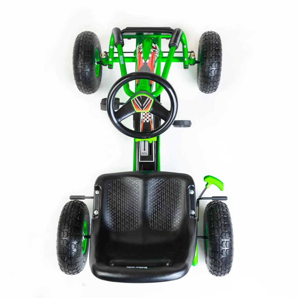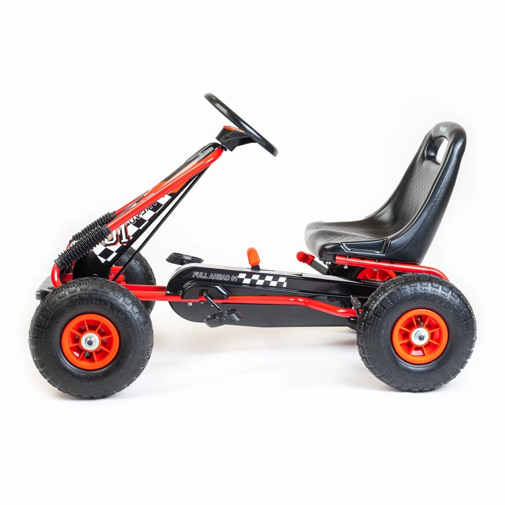 Bezpečnosť je na prvom mieste: ručná brzda pôsobí na obe zadné kolesá, reťaz je krytá a prevodovka ponúka režimy vpred/vzad a voľnobeh. Motokára spĺňa európske bezpečnostné normy a vďaka odolnému prevedeniu zvládne každodenné dobrodružstvá na záhrade aj na ihrisku.
