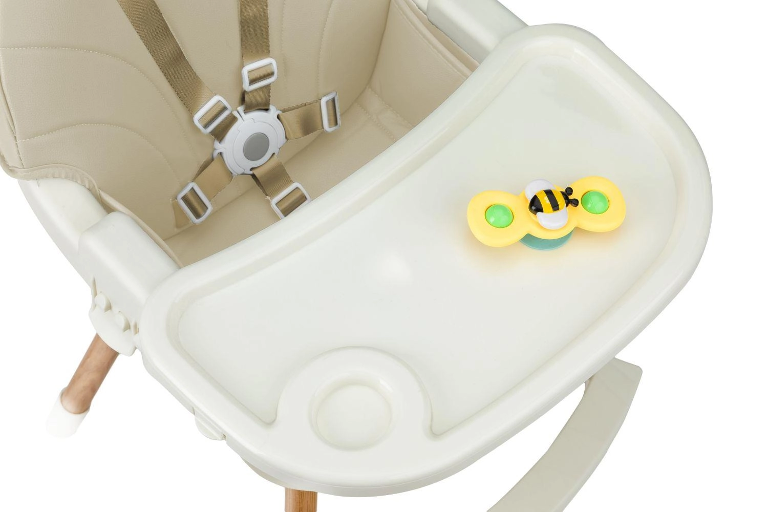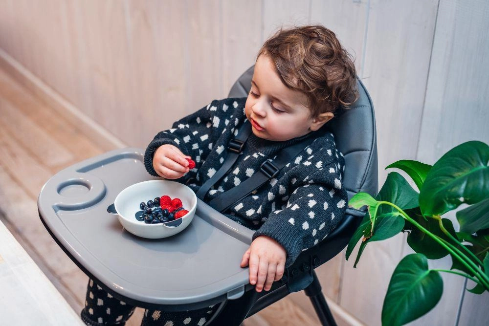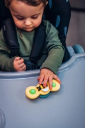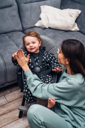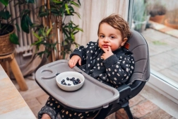 5-bodové pásy, stabilná konštrukcia s opierkou na nohy a posuvný tác s držiakom nápoja zaistia komfort a bezpečie pri kŕmení.