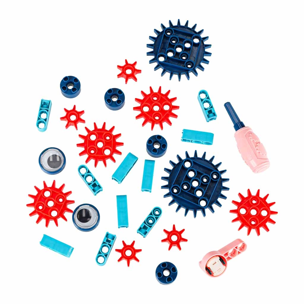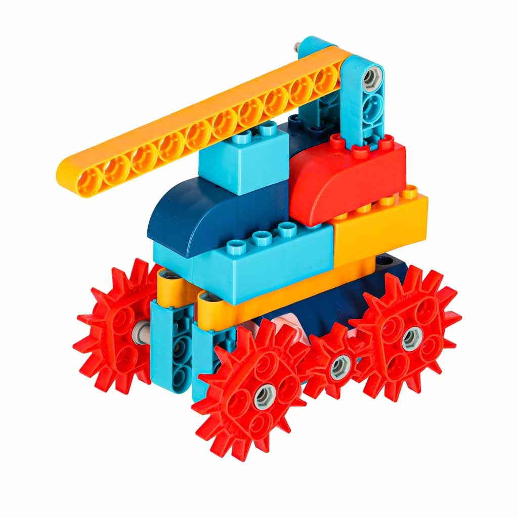 Rôzne veľké ozubené kolieska, hriadele a spojky umožňujú prevody a rotáciu. Deti si prakticky vyskúšajú princípy mechaniky a prenosu pohybu.
