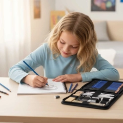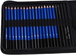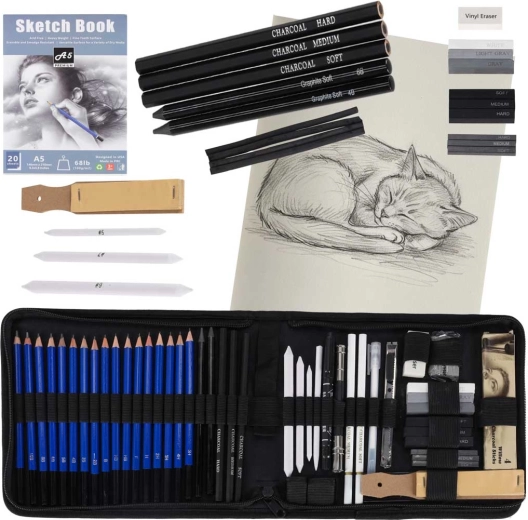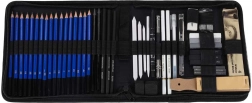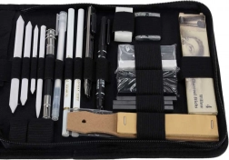 Táto komplexná súprava na skicovanie je ideálna pre začiatočníkov aj pokročilých. Nájdete v nej grafitové ceruzky od 12B po 5H, čierny aj biely uhoľ v ceruzke, štyfty na plošné ťahy a papierové estompy pre plynulé prechody tónov. Všetko je prehľadne usporiadané v odolnom nylonovom puzdre, ktoré drží výbavu bezpečne na svojom mieste.