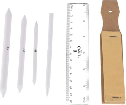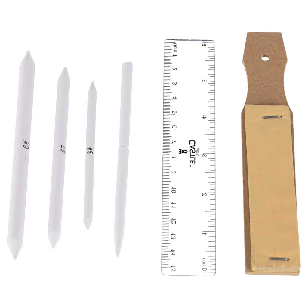 Papierové estompy rôznych veľkostí, brúsna doštička a pravítko pre čisté prechody, detaily aj presné línie.