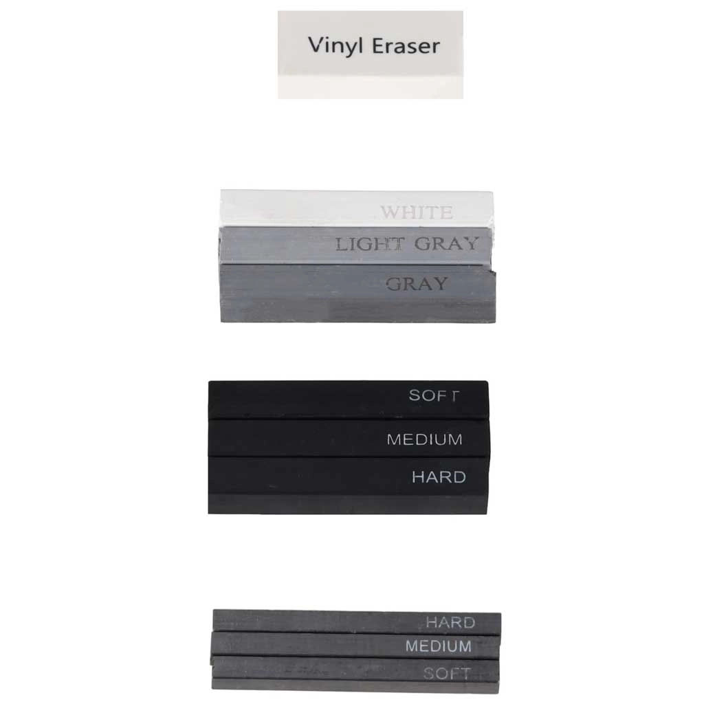 Na zvýraznenie svetiel využijete biely gélový popisovač a biele uhoľ ceruzky, na korekcie zas vinylovú a tvarovaciu (chlebovú) gumu. Nechýbajú strúhadlá, predĺženie na ceruzky, pravítko ani brúsna doštička pre perfektný tvar hrotov.