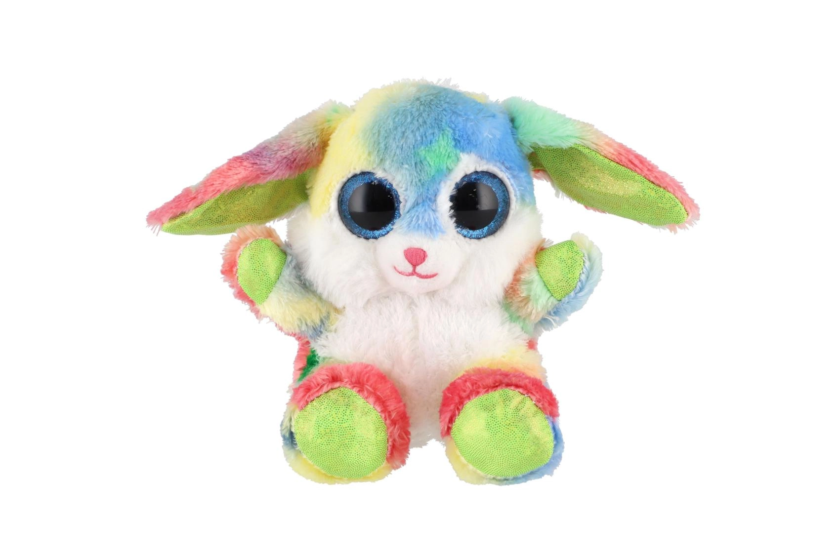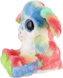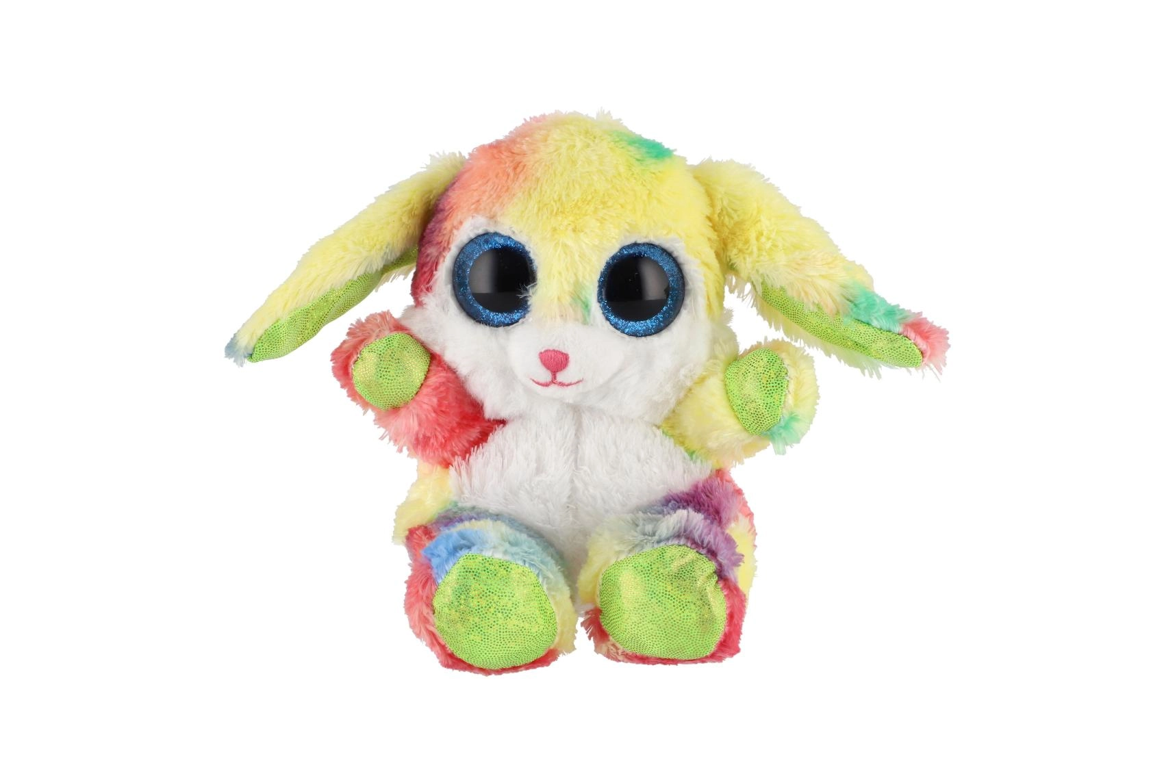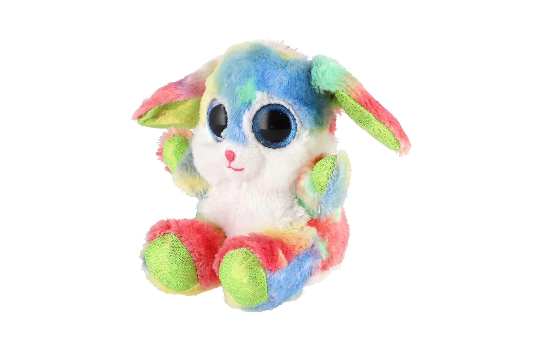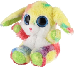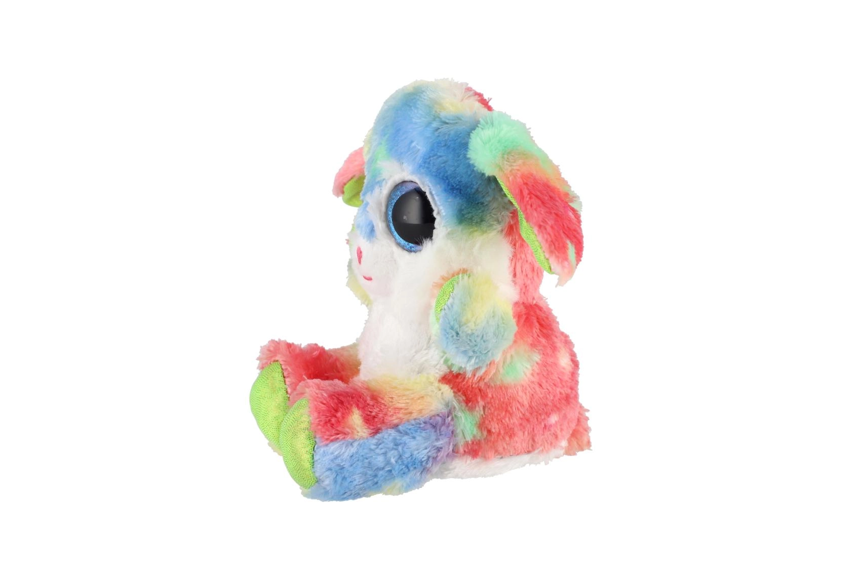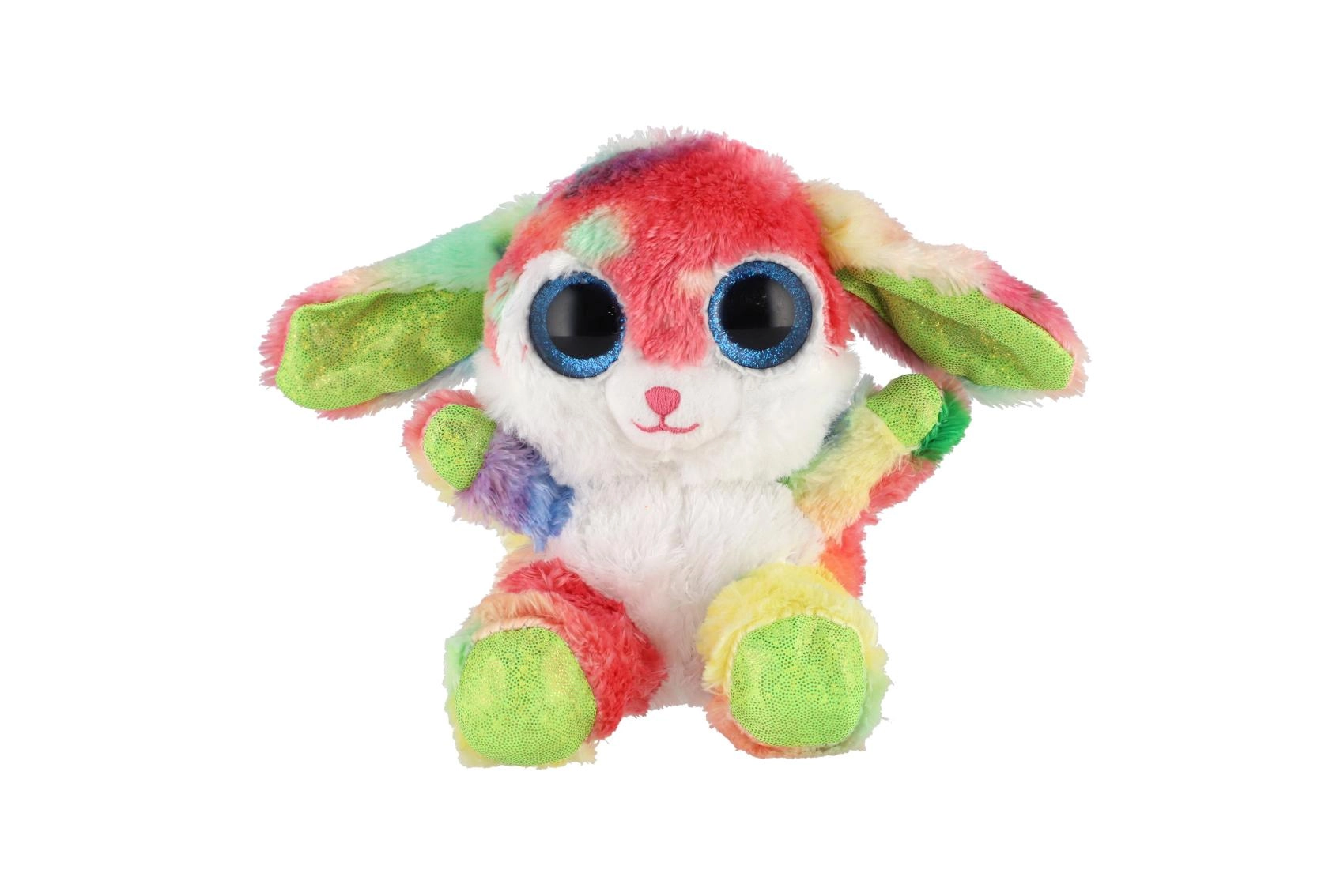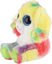 Roztomilý sediaci zajačik v dúhových farbách s veľkými trblietavými očami je ideálny maznáčik pre deti. Je vyrobený z extra mäkkého plyšu, má dlhé ohybné ušká a kompaktnú veľkosť 15 cm na jednoduché nosenie do postieľky, do batôžka aj na cesty.