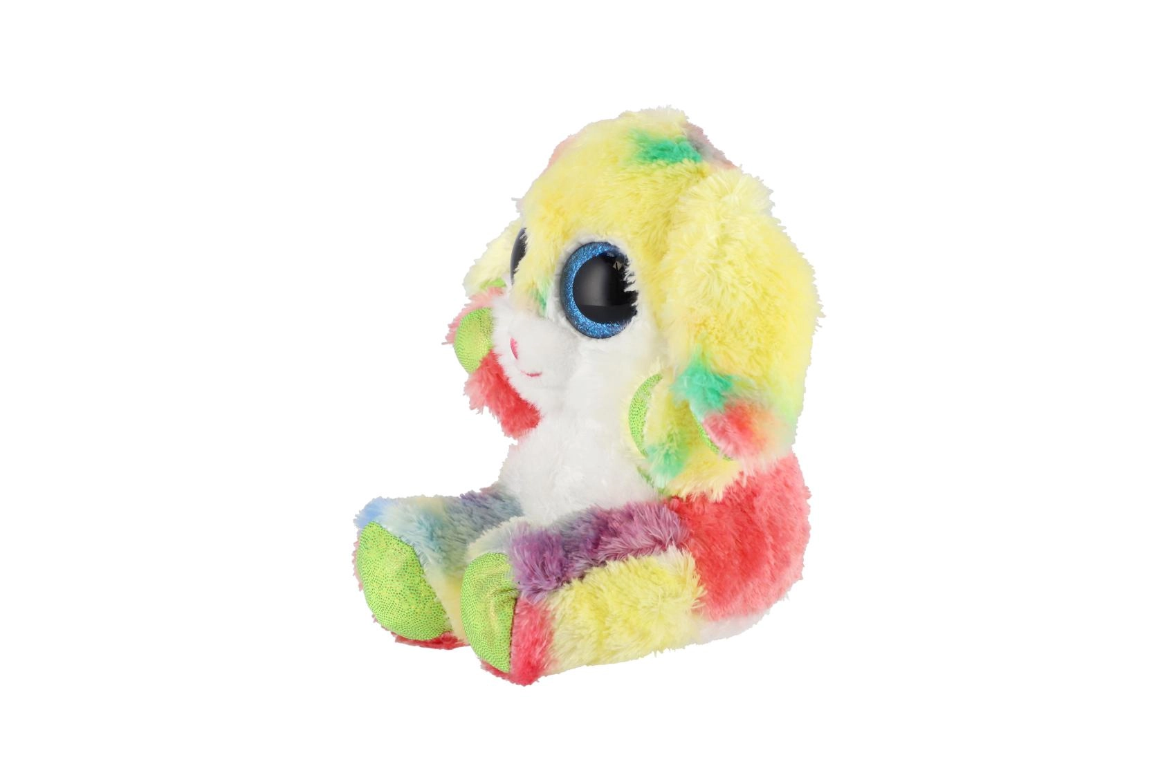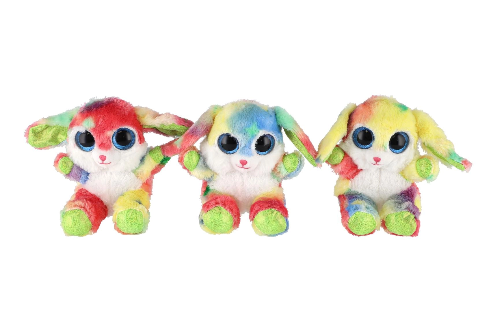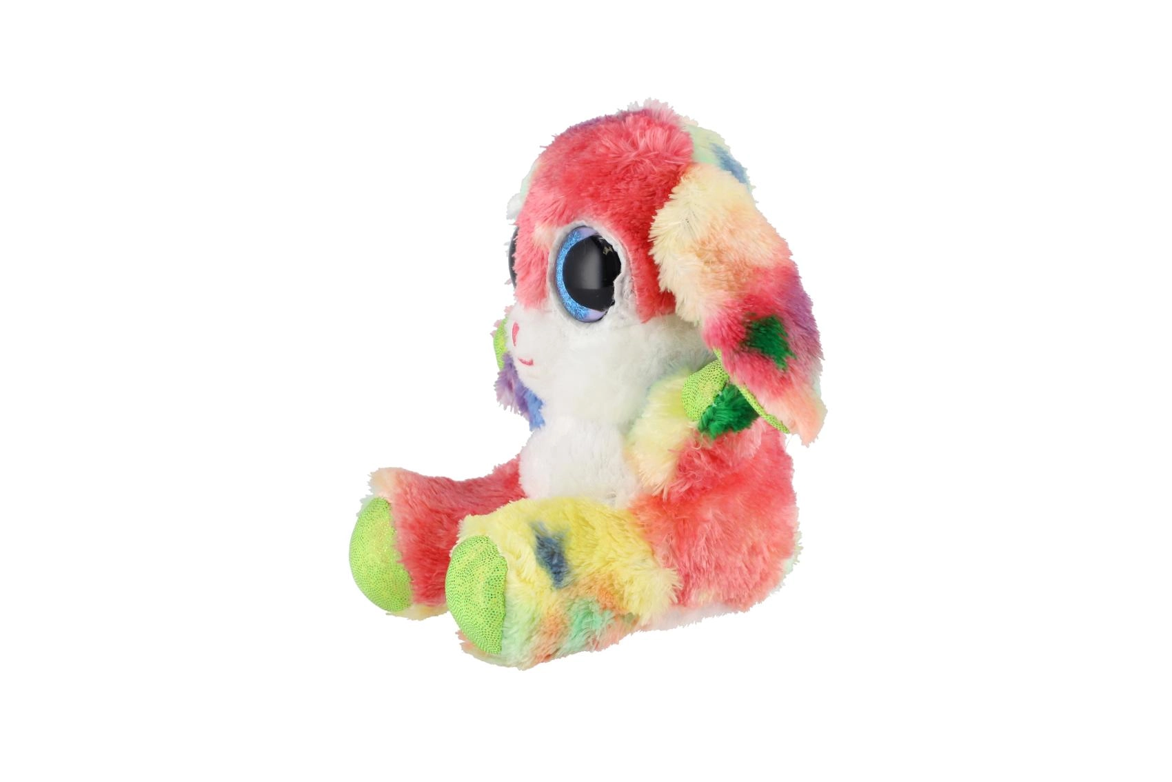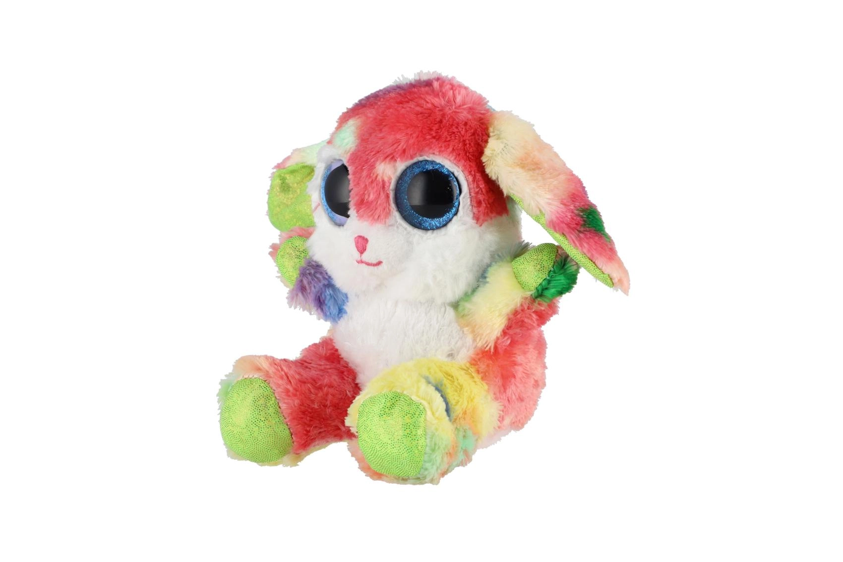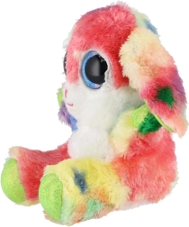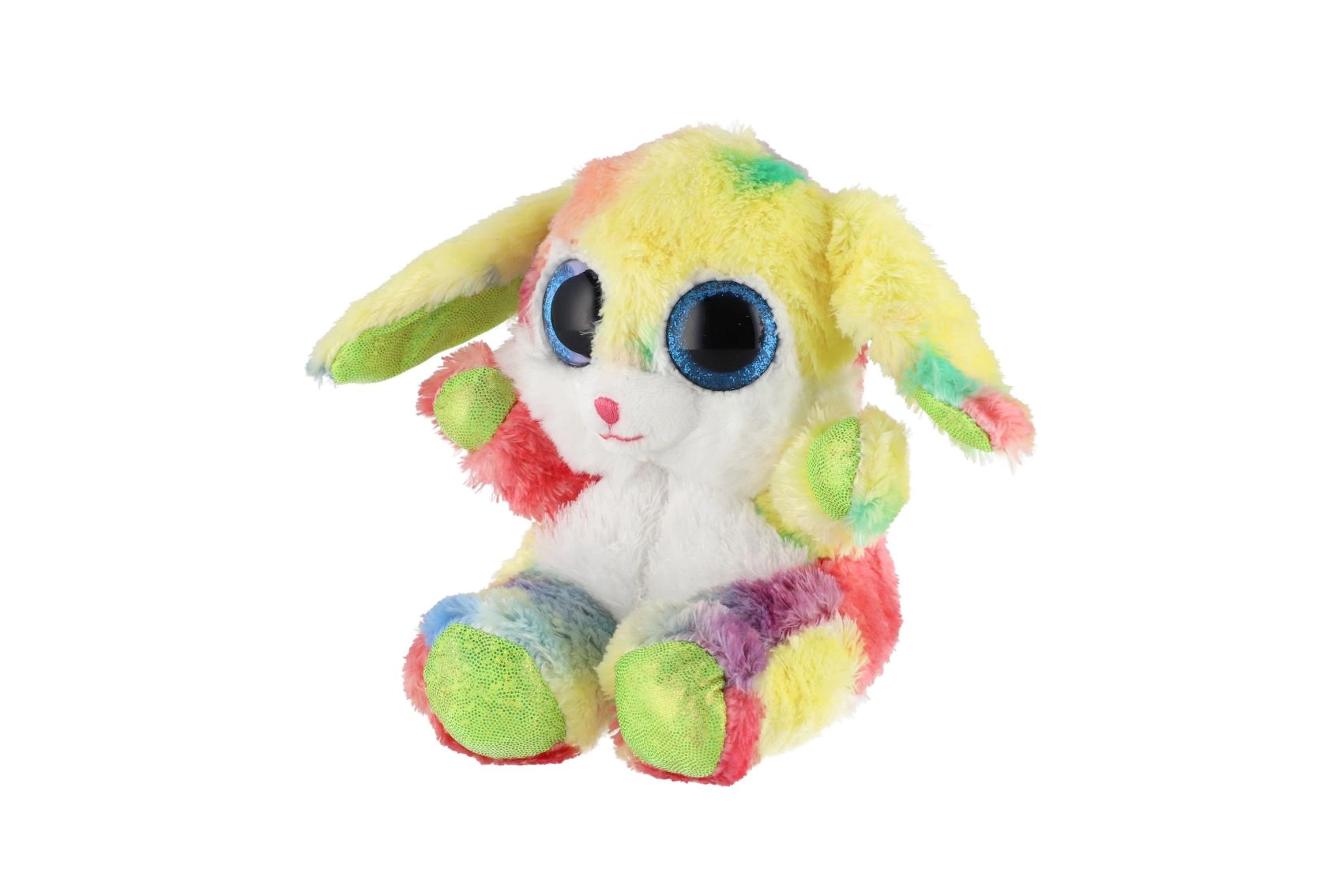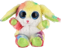 Roztomilý sediaci zajačik v dúhových farbách s veľkými trblietavými očami je ideálny maznáčik pre deti. Je vyrobený z extra mäkkého plyšu, má dlhé ohybné ušká a kompaktnú veľkosť 15 cm na jednoduché nosenie do postieľky, do batôžka aj na cesty.