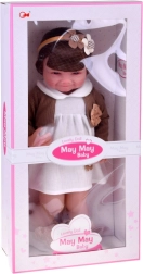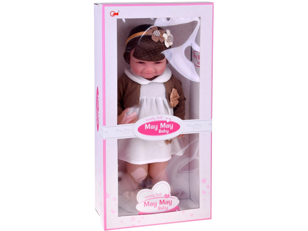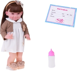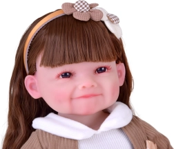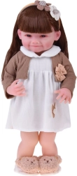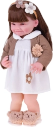 Táto krásna bábika je oblečená do bielych šatičiek s kvetinovou aplikáciou a hnedého svetríka s mašličkou. Outfit dopĺňajú mäkké papuče v tvare medvedíkov a béžová čelenka s ozdobou, ktoré podčiarkujú nežný, detsky sladký vzhľad. Vďaka realistickej tvári a dlhým vlasom si deti užijú hodiny kreatívnej zábavy.