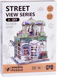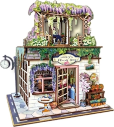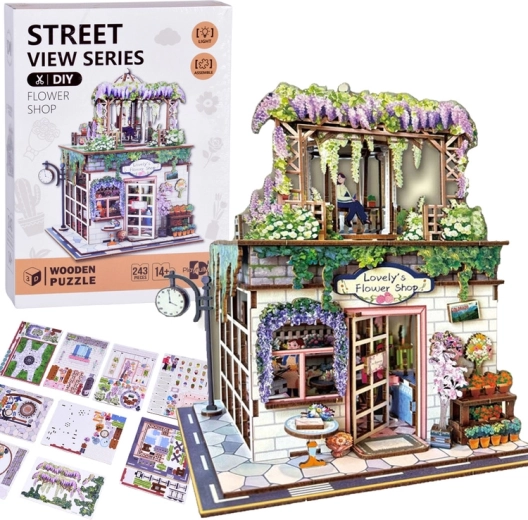 Objavte čaro miniatúr s detailným modelom kvetinárstva, ktorý po zložení rozžiari jemné LED osvetlenie a vytvorí magickú atmosféru. Cez okná nahliadnete do bohato vybaveného interiéru s policami a kyticami, strechu zdobí altánok s popínavými kvetmi. Stabilná konštrukcia z kvalitného dreva poteší ako štýlová dekorácia do bytu aj ako originálny darček.