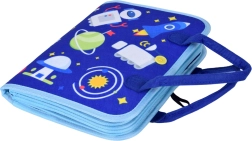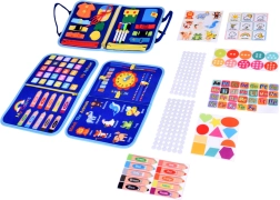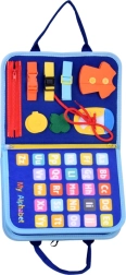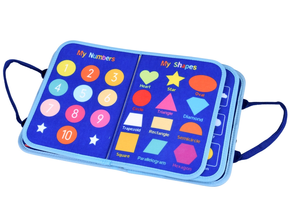 Prenosná textilná aktívna knižka pre deti s 10 interaktívnymi stranami rozvíja jemnú motoriku, logiku a kreativitu. Obsahuje aktivity ako abeceda, čísla 1–10, tvary, farby, počasie, zvieratká, kalendár a hodiny aj sucho stierateľnú tabuľku s fixkami. Mäkké materiály, zips a uši zabezpečujú bezpečnú a jednoduchú manipuláciu doma aj na cestách.