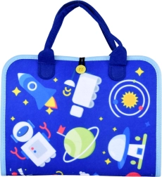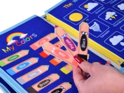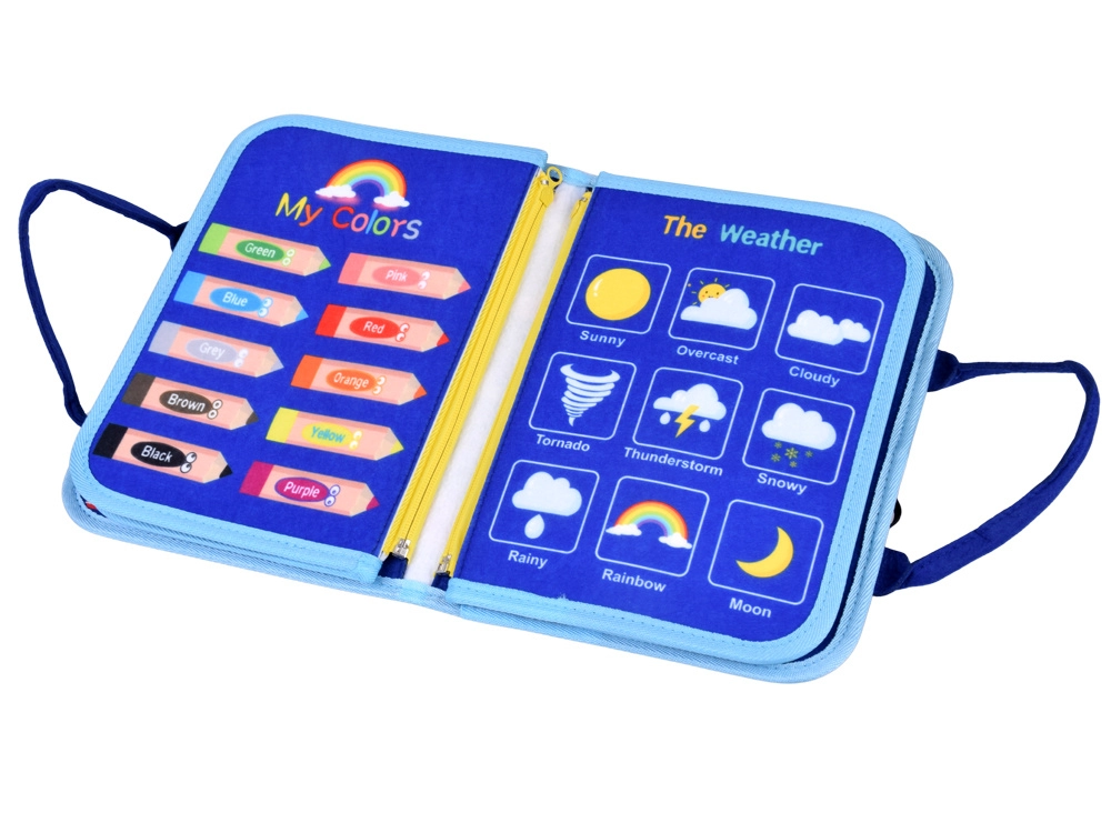 - Knižná taška, odnímateľné filcové dieliky (písmená, tvary, zvieratká, farby), kolieska so slniečkami 1–10, kartičky s počasím, sucho stierateľná tabuľka, 4 farebné fixky, samolepiace suché zipsy
